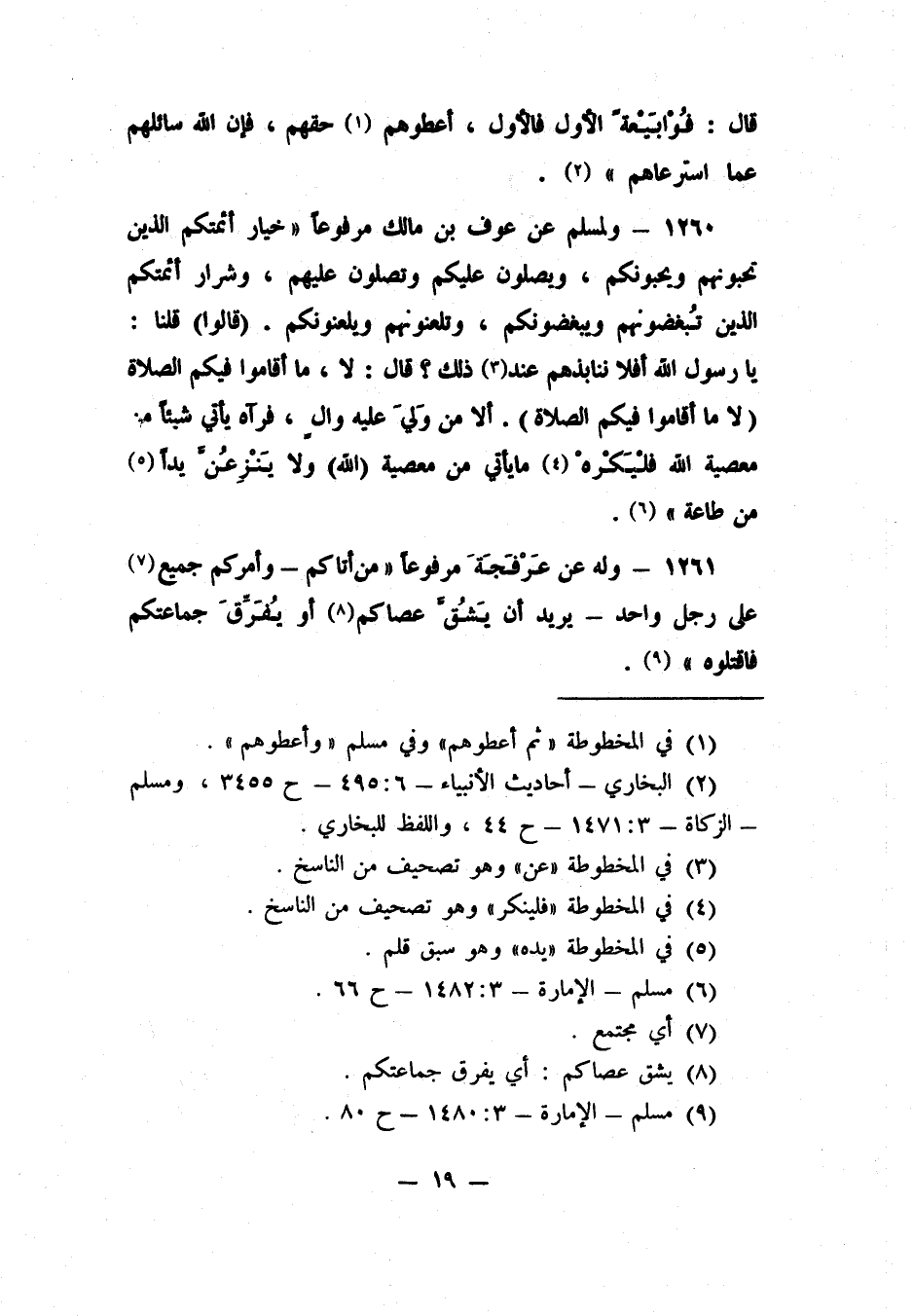 1260- ولمسلم عن عوف بن مالك، مرفوعاً: "خيار أئمتكم الذين تحبونهم ويحبونكم، ويصلون عليكم وتصلون عليهم. وشرار أئمتكم الذين تُبغضونهم ويبغضونكم، وتلعنونهم ويلعنونكم. (قالوا:) قلنا: يا رسول الله، أفلا ننابذهم عند 3 ذلك؟ قال: لا. ما أقاموا فيكم الصلاة. (لا. ما أقاموا فيكم الصلاة) . ألا مَن وَليَ عليه والٍ، فرآه يأتي شيئاً من معصية الله، فلْيَكْرهْ 4 ما يأتي من معصية (الله) ، ولا يَنْزِعَنَّ يداً 5 من طاعة" 6.