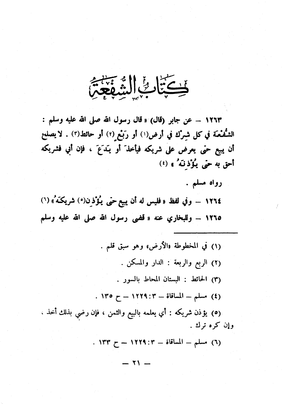 1263- عن جابر (قال:) قال رسول الله صلى الله عليه وسلم: "الشُّفْعَة في كل شِرْك في أرض، 1 أو رَبْعٍ، 2 أو حائط. 3 لا يصلح أن يبيع حتى يعرض على شريكه فيأخذَ أو يَدَعَ. فإن أبى، فشريكه أحق به حتى يُؤْذِنَهُ" 4. رواه مسلم.