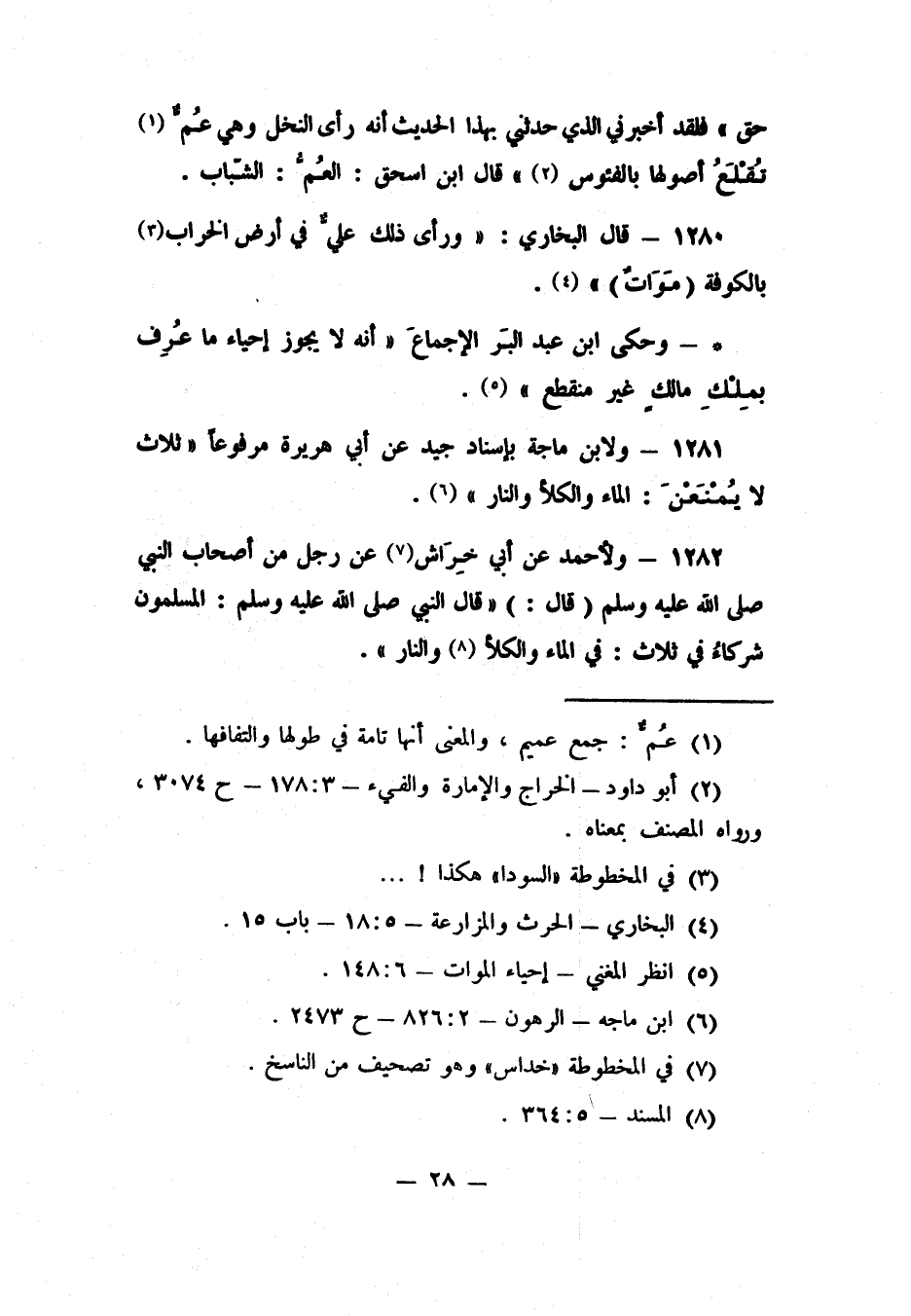 1281- ولابن ماجة، بإسناد جيد، عن أبي هريرة، مرفوعاً: "ثلاث لا يُمنعن: الماء، والكلأ، والنار" 6.