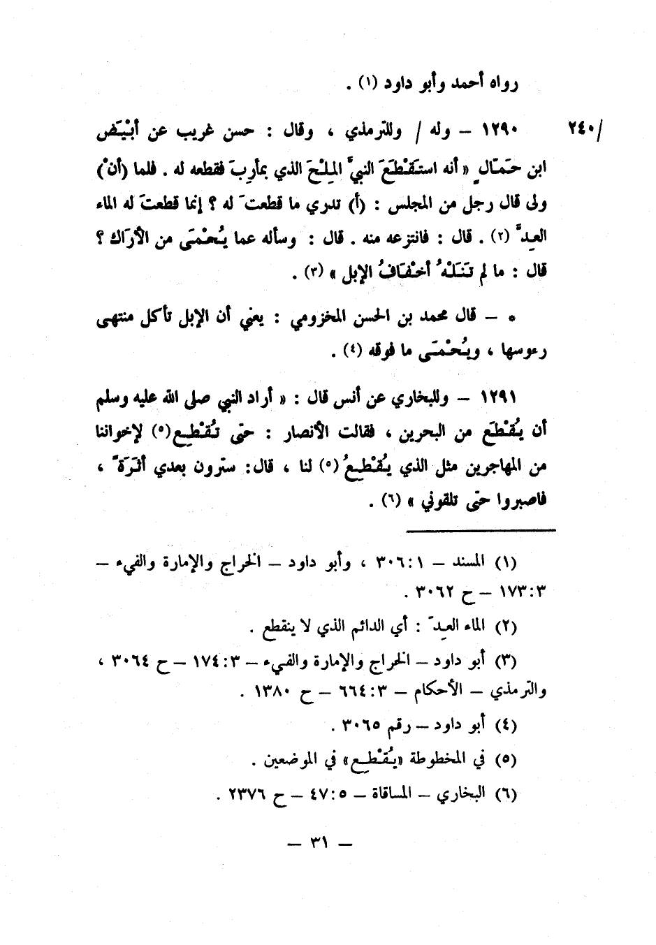 1290- وله وللترمذي، وقال: حسن غريب عن أبيض بن حَمّالٍ: "أنه استَقْطَعَ النبيَّ المِلْحَ الذي بمأرِبَ، فقطعه له، فلما (أنْ) ولى قال رجل من المجلس: أتدري ما قطعتَ له؟ إنما قطعتَ له الماء العدَّ. 2 قال: فانتزعه منه، قال: وسأله عما يُحْمَى من الأرَاك؟ قال: ما لم تَنَلْهُ أخْفَافُ الإبل" 3.