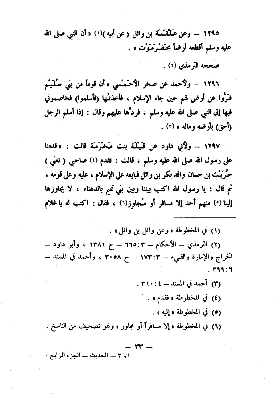 1296- ولأحمد عن صخر الأحَمْسي: "أن قوماً من بني سُلَيْم فَرُّوا عن أرض لهم حين جاء الإسلام، فأخذتُها. (فأسلموا) فخاصموني فيها إلى النبي صلى الله عليه وسلم، فردَّها عليهم وقال: إذا أسلم الرجل فهو (أحق) بأرضه وماله" 3.