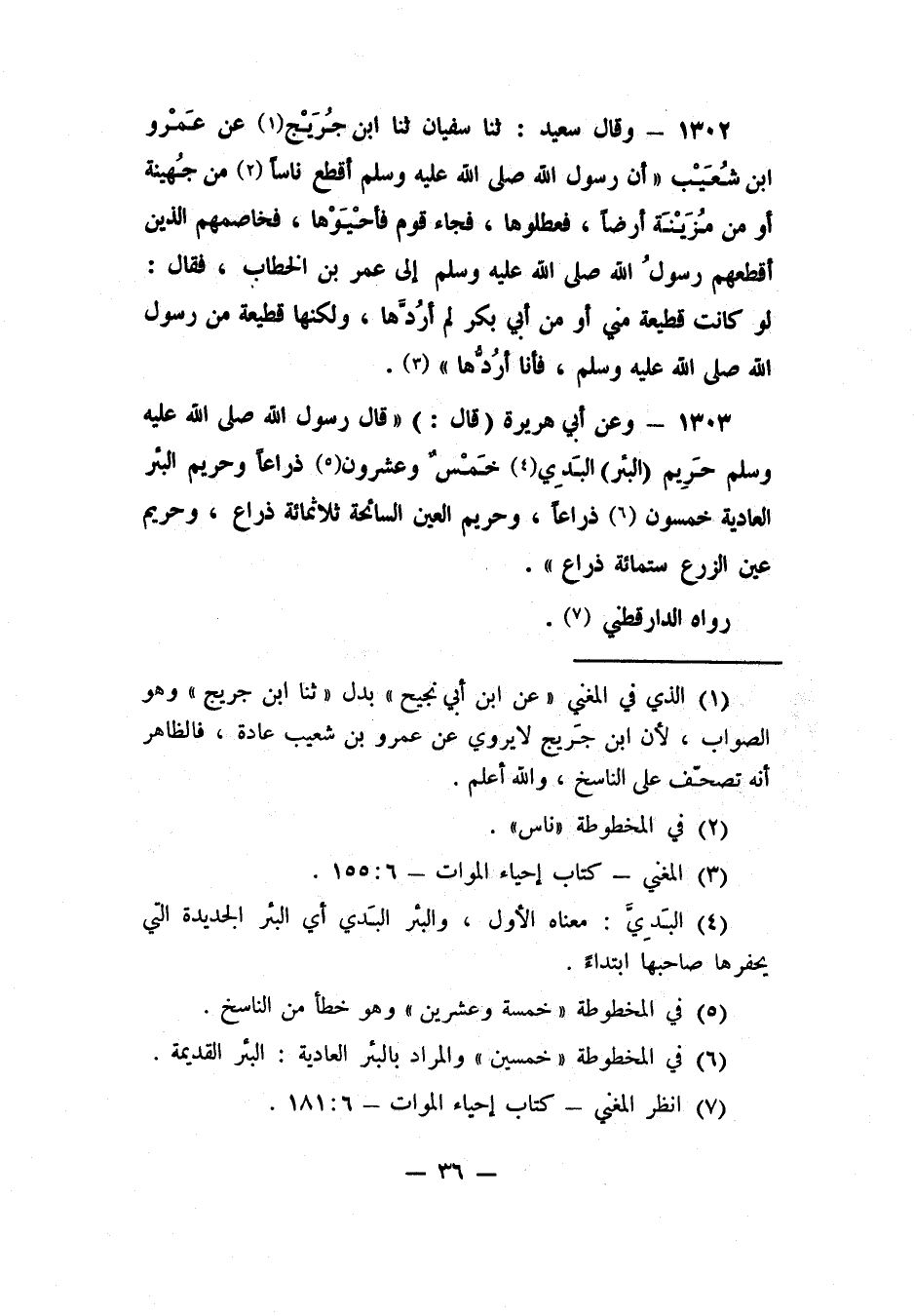 1303- وعن أبي هريرة (قال:) قال رسول الله صلى الله عليه وسلم: "حَرِيم (البئر) البَدِي: 4 خَمْسٌ وعشرون 5 ذراعاً، وحريم البئر العادية: خمسون 6 ذراعاً، وحريم العين السائحة: ثلاثمائة ذراع، وحريم عين الزرع: ستمائة ذراع". رواه الدارقطني 7.