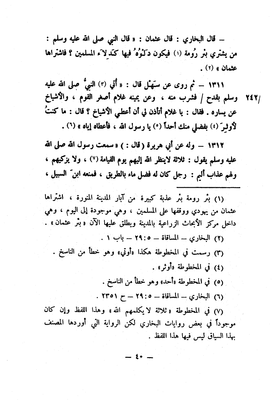 1311- ثم روى عن سَهْل قال: "أُتي 3 النبيُّ صلى الله عليه وسلم بقدح فشرب منه، وعن يمينه غلام أصغر القوم، والأشياخ عن يساره. فقال: يا غلام، أتأذن لي أن أعطي الأشياخ؟ قال: ما كنتُ لأوثِرَ 4 بفضلي منك أحداً 5 يا رسول الله، فأعطاه إياه" 6.