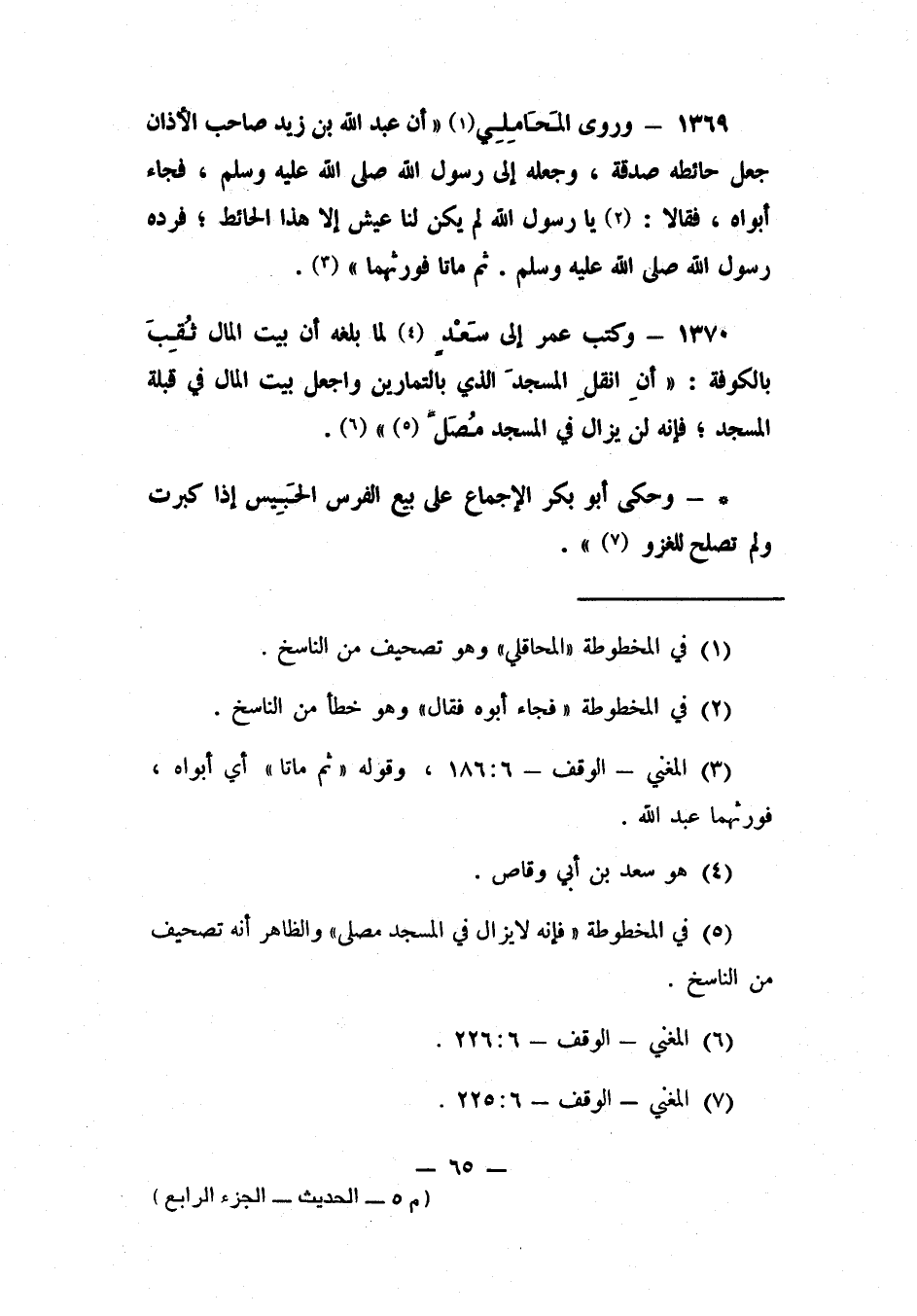 1369- وروى المَحَامِلِي: 1 "أن عبد الله بن زيد، صاحب الأذان، جعل حائطه صدقة، وجعله إلى رسول الله صلى الله عليه وسلم. فجاء أبواه، فقالا: 2 يا رسول الله، لم يكن لنا عيش إلا هذا الحائط. فرده رسول الله صلى الله عليه وسلم. ثم ماتا فورثهما" 3.