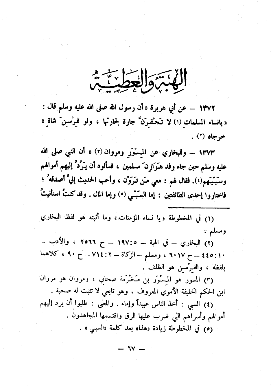 1372- عن أبي هريرة أن رسول الله صلى الله عليه وسلم قال: "يا نساء المسلمات، 1 لا تحقرن جارة لجارتها، ولو فِرْسِنَ شاةٍ". خرجاه 2.