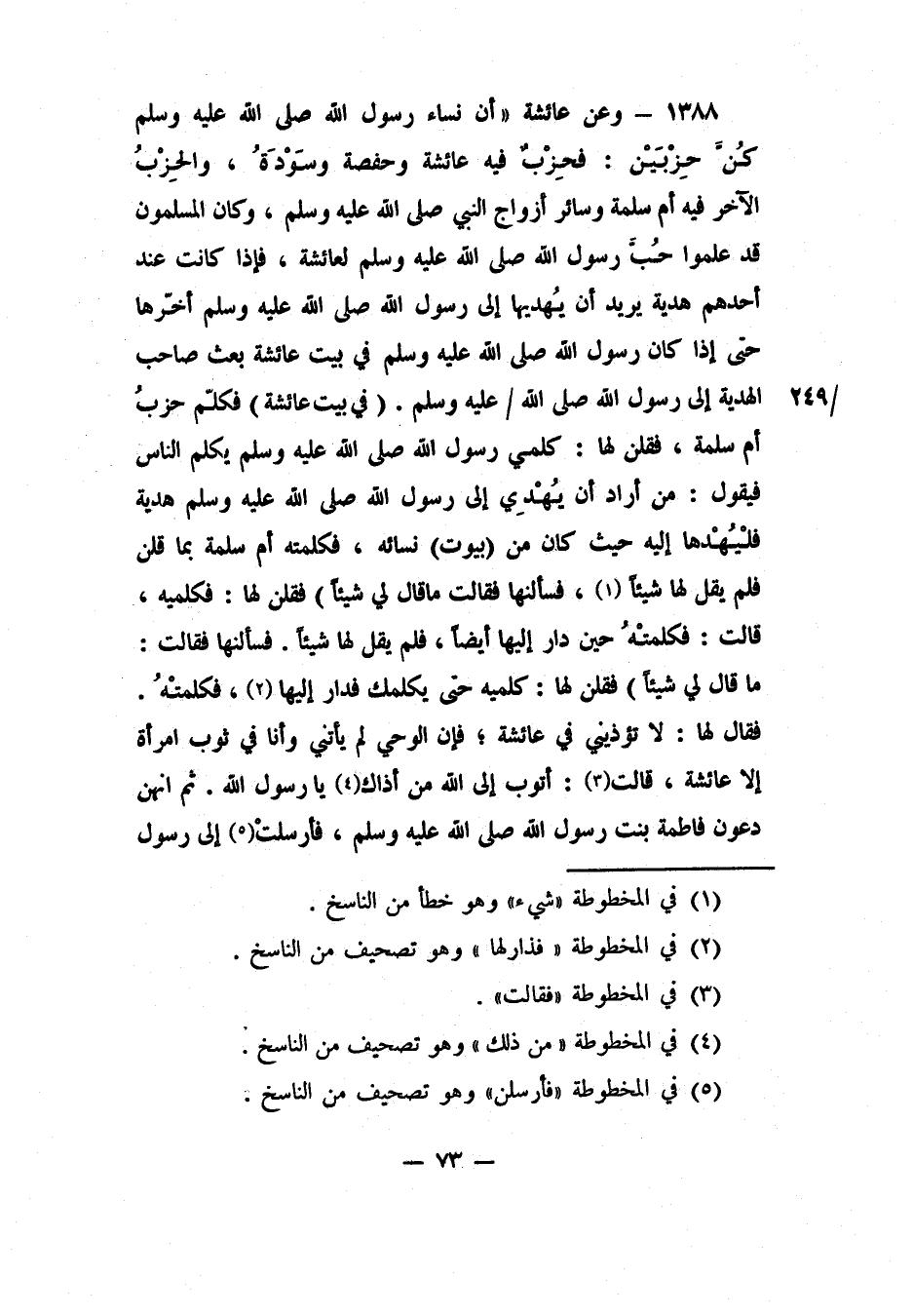 1388- وعن عائشة: "أن نساء رسول الله صلى الله عليه وسلم كُنَّ حِزْبَيْن: فحِزْبٌ فيه عائشة وحفصة وسَوْدَةُ، والحِزْبُ الآخر فيه أم سلمة وسائر أزواج النبي صلى الله عليه وسلم. وكان المسلمون قد علموا حُبَّ رسول الله صلى الله عليه وسلم لعائشة؛ فإذا كانت عند أحدهم هدية يريد أن يُهديها إلى رسول الله صلى الله عليه وسلم، أخّرها حتى إذا كان رسول الله صلى الله عليه وسلم في بيت عائشة بعث صاحب الهدية إلى رسول الله صلى الله عليه وسلم (في بيت عائشة) . فكلّم حزبُ أم سلمة، فقلن لها: كلمي رسول الله صلى الله عليه وسلم يكلم الناس فيقول: من أراد أن يُهْدِي إلى رسول الله صلى الله عليه وسلم هدية فلْيُهْدها إليه حيث كان من (بيوت) نسائه. فكلمته أم سلمة بما قلن، فلم يقل لها شيئاً. 1 فسألنها، فقالت: ما قال لي شيئاً) . فقلن لها: فكلميه، قالت: فكلمتْهُ حين دار إليها أيضاً، فلم يقل لها شيئاً. فسألنها، فقالت: ما قال لي شيئاً) . فقلن لها: كلِّميه حتى يكلمك. فدار إليها، 2 فكلمتْهُ، فقال لها: لا تؤذيني في عائشة; فإن الوحي لم يأتني وأنا في ثوب امرأة إلا عائشة. قالت: 3 أتوب إلى الله من أذاك 4 يا رسول الله. ثم أنهن دعون فاطمة بنت رسول الله صلى الله عليه وسلم، فأرسلت 5 إلى رسول