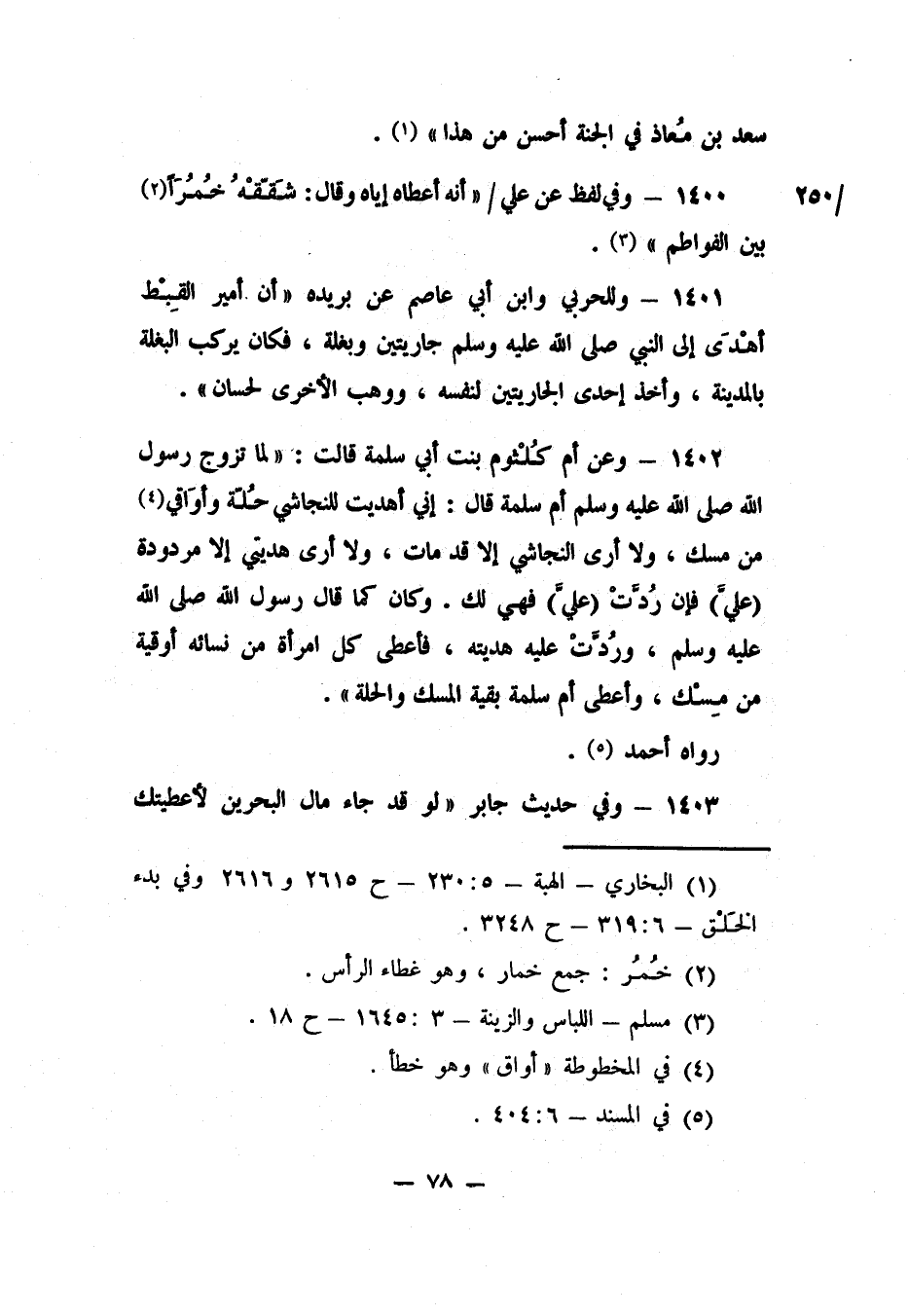 1402- وعن أم كُلْثوم بنت أبي سلمة قالت: "لما تزوج رسول الله صلى الله عليه وسلم أم سلمة، قال: إني أهديت للنجاشي حُلّة وأوَاقي 4 من مسك. ولا أرى النجاشي إلا قد مات، ولا أرى هديتي إلا مردودة (عَلَيَّ) . فإن رُدَّتْ (عَلَيَّ) فهي لك. وكان كما قال رسول الله صلى الله عليه وسلم. ورُدَّتْ عليه هديته، فأعطى كل امرأة من نسائه أوقية من مِسْك، وأعطى أم سلمة بقية المسك والحلة". رواه أحمد 5.