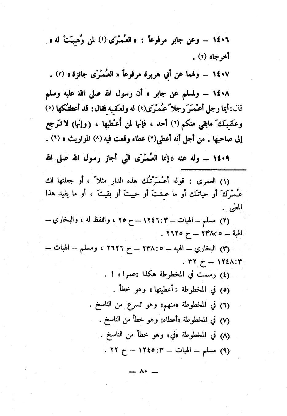 1408- ولمسلم عن جابر أن رسول الله صلى الله عليه وسلم قال: "أيما رجل أعْمَرَ رجلاً عُمْرَى 4 له ولعقِبه، فقال: قد أعطيتكها 5 وعَقِبَكَ ما بقي منكم 6 أحد، فإنها لمن أُعْطيها، (وإنها) لا تَرجع إلى صاحبها من أجل أنه أعطى 7 عطاء وقعت فيه 8 المواريث" 9.