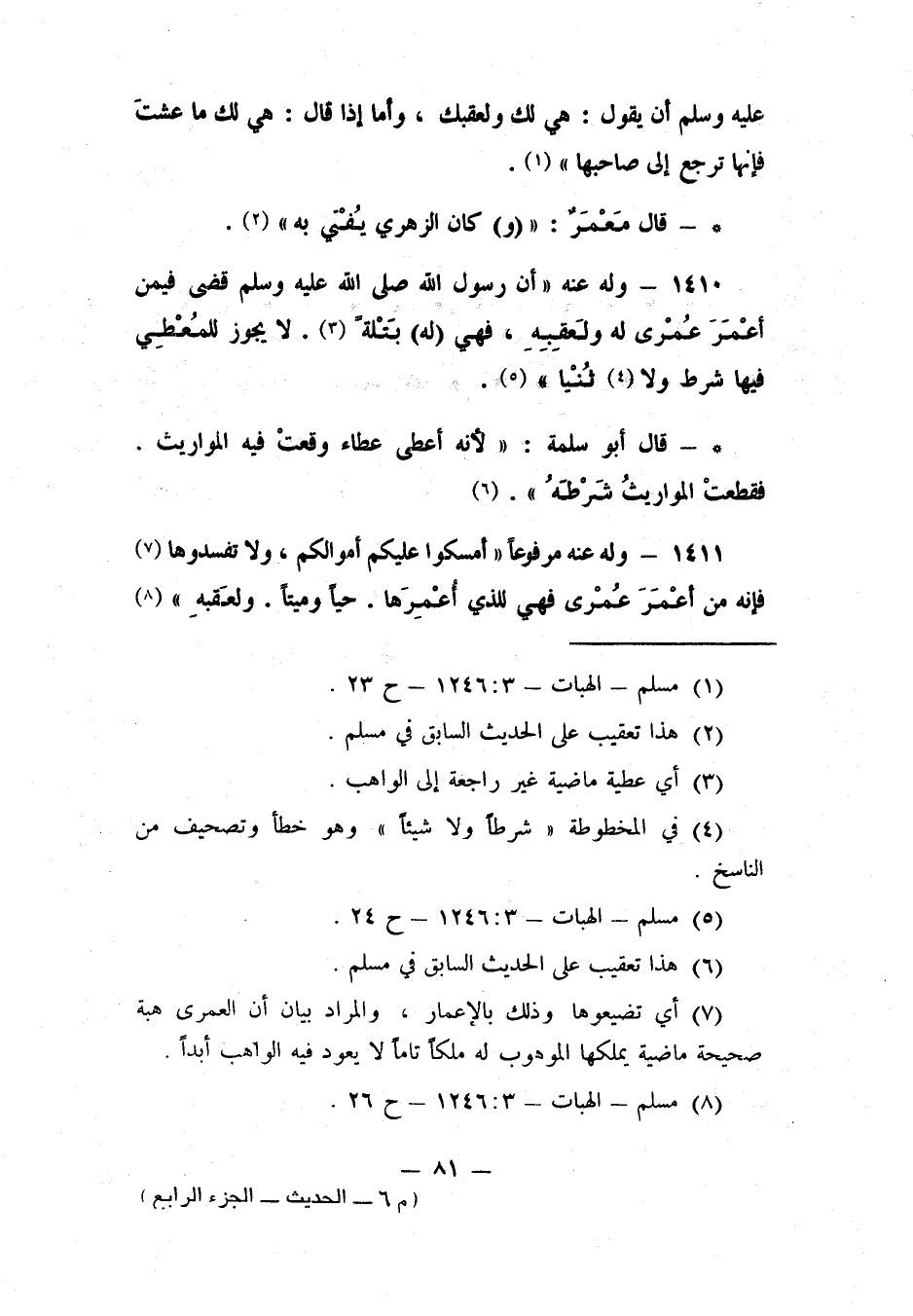 1410- وله عنه: "أن رسول الله صلى الله عليه وسلم قضى فيمن أعْمَرَ عُمْرى له ولعقِبه، فهي (له) بَتْلةً. 3 لا يجوز للمُعْطِي فيها شرط، ولا 4 ثُنْيا" 5.