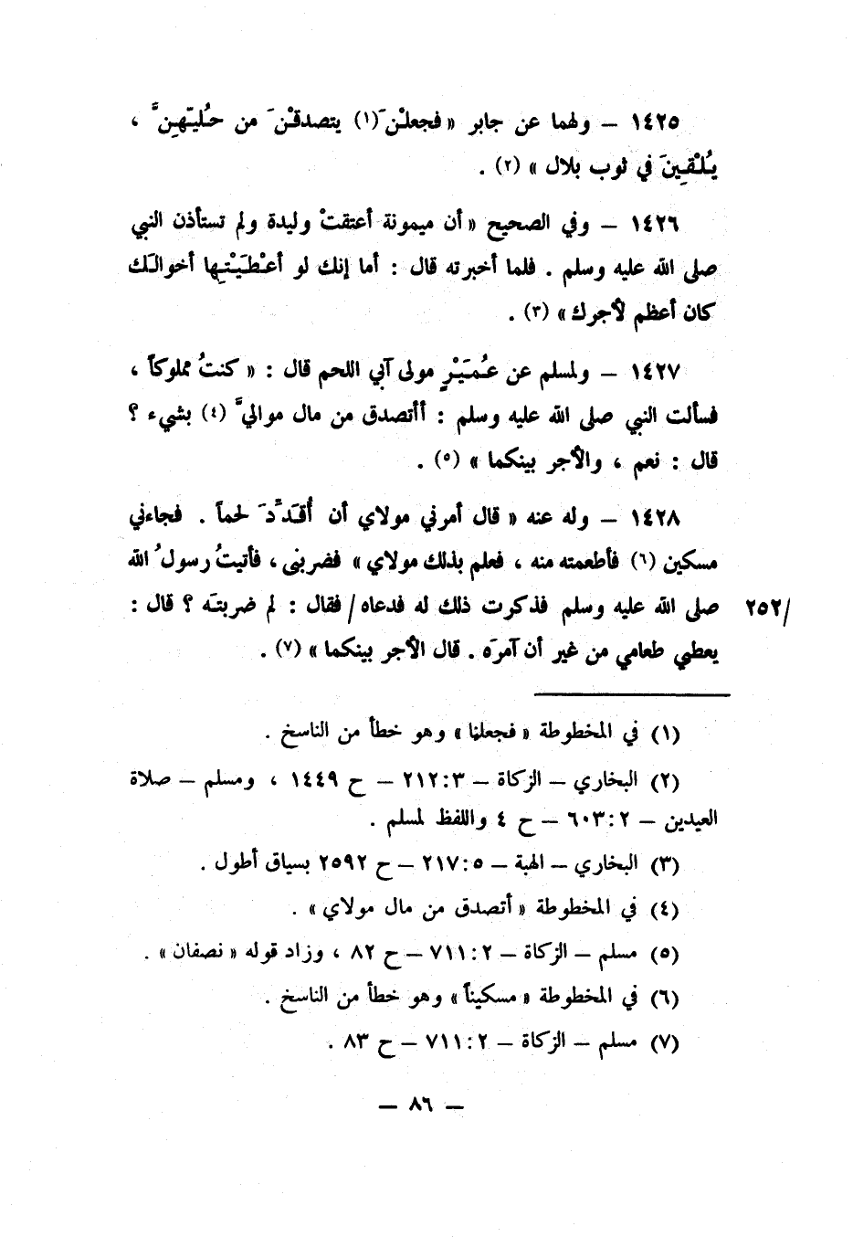 1427- ولمسلم عن عُمَيْرٍ مولى آبي اللحم قال: "كنتُ مملوكاً، فسألت النبي صلى الله عليه وسلم: أأتصدق من مال موالي بشيء؟ قال: نعم، والأجر بينكما" 4.