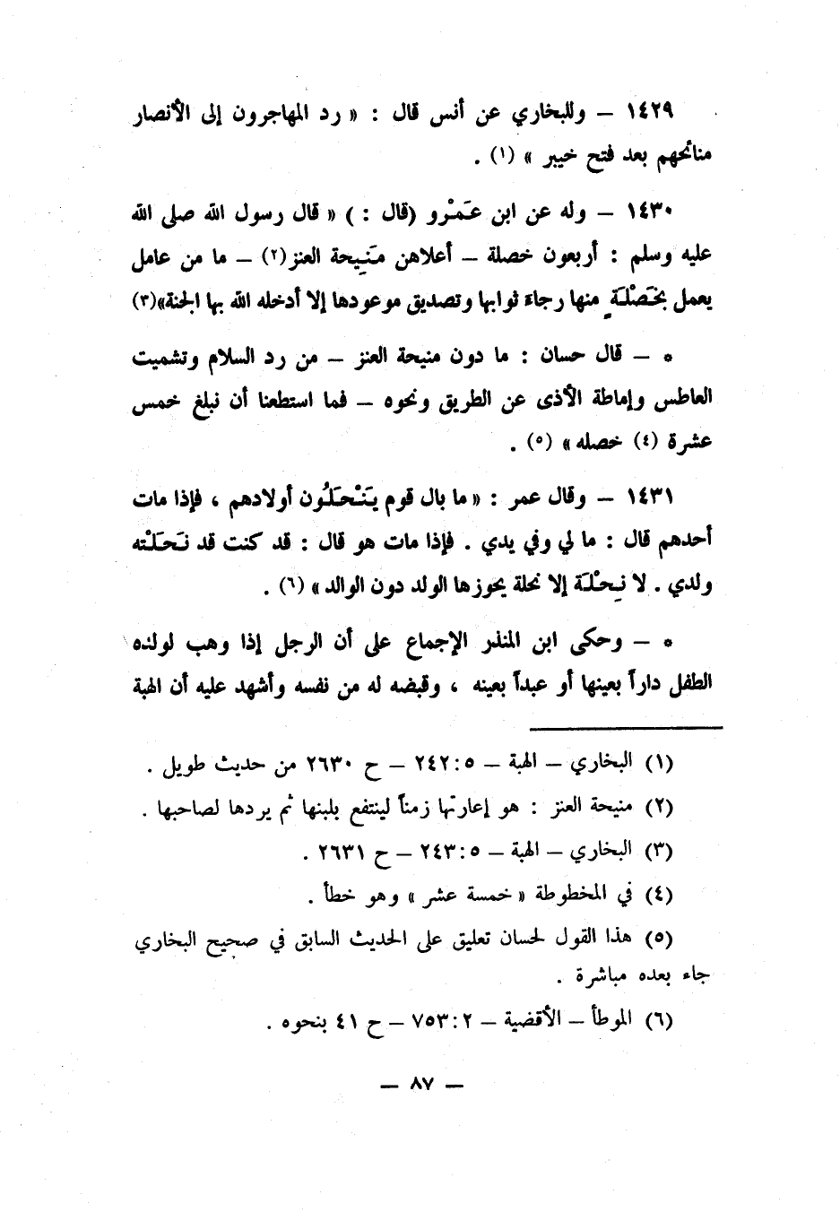 - قال حسان: "فعددنا ما دون منيحة العنز - مِن رد السلام، وتشميت العاطس، وإماطة الأذى عن الطريق، ونحوه - فما استطعنا أن نبلغ خمس عشرة 4 خصلة" 5.