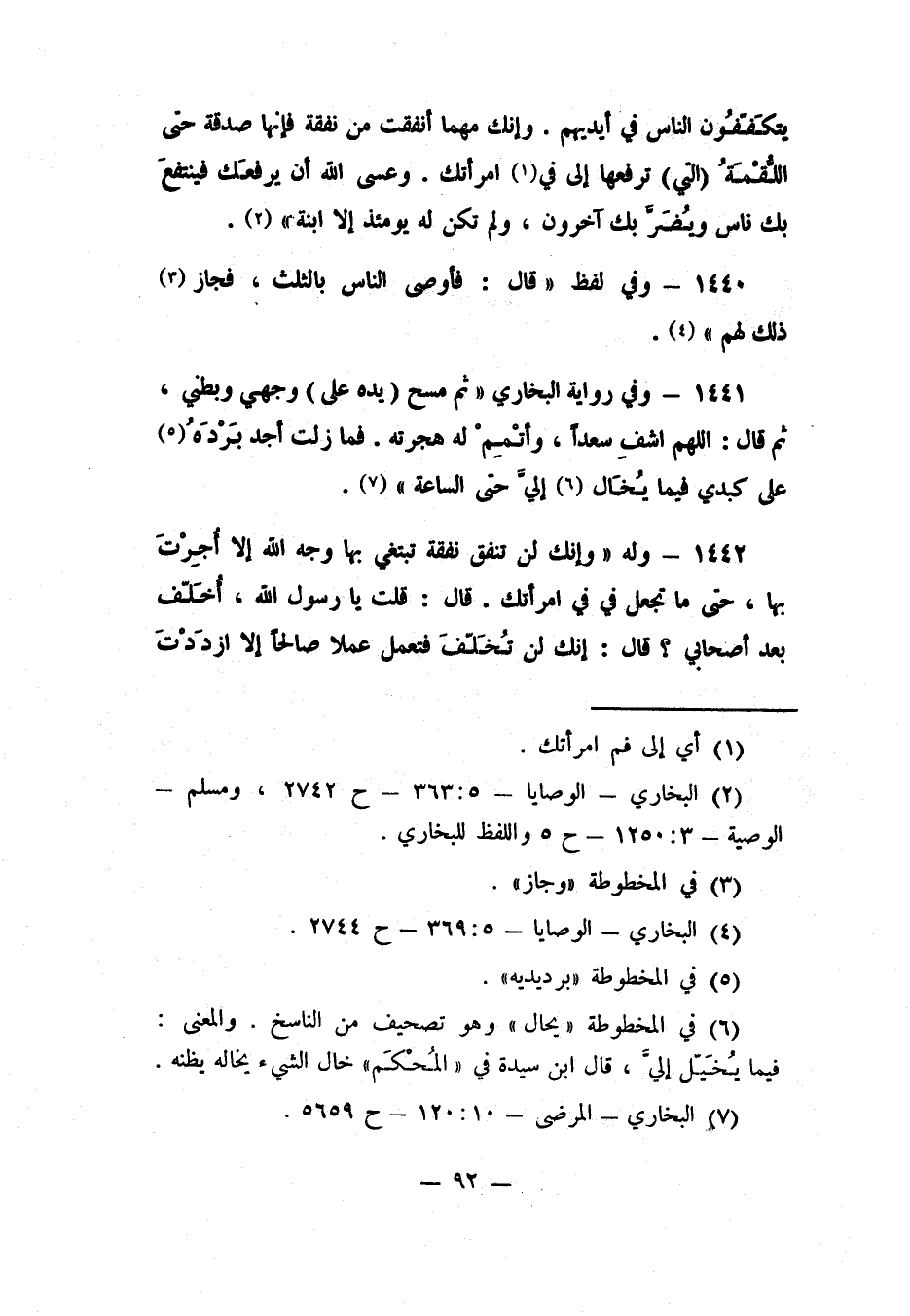1442- وله: "وإنك لن تنفق نفقة تبتغي بها وجه الله إلا أُجرت بها، حتى ما تجعل في في امرأتك. قال: قلت: يا رسول الله، أُخَلّف بعد أصحابي؟ قال: إنك لن تُخَلّفَ فتعمل عملا صالحاً إلا ازددت