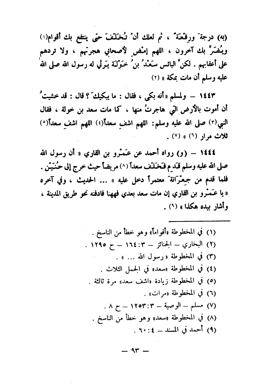 1443- ولمسلم: "أنه بكى، فقال: ما يبكيكَ؟ قال: قد خشيتُ أن أموت بالأرض التي هاجرتُ منها، كما مات سعد بن خولة، فقال النبي 3 صلى الله عليه وسلم: اللهم اشفِ سعداً. 4 اللهم اشفِ سعداً. 5 ثلاث مرار 6") 7.