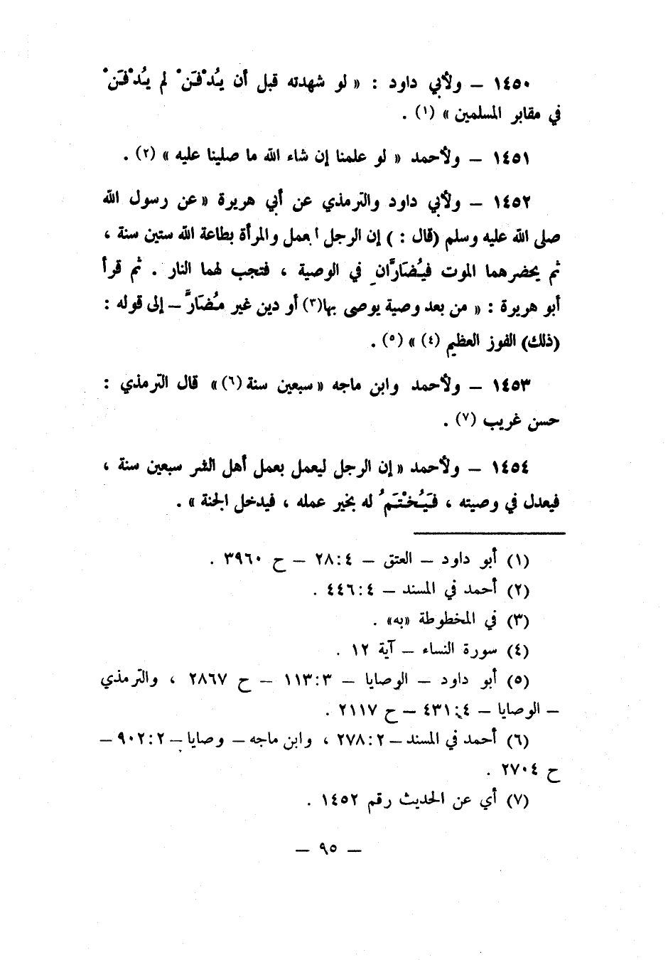 1452- ولأبي داود والترمذي عن أبي هريرة عن رسول الله صلى الله عليه وسلم (قال) : "إن الرجل ليعمل والمرأة بطاعة الله ستين سنة، ثم يحضرهما الموت فيُضَارَّانِ في الوصية؛ فتجب لهما النار". ثم قرأ أبو هريرة: {مِنْ بَعْدِ وَصِيَّةٍ يُوصَى بِهَا أَوْ دَيْنٍ غَيْرَ مُضَارٍّ} 3 - إلى قوله – {ذَلِكَ الْفَوْزُ الْعَظِيمُ} 4" 5.