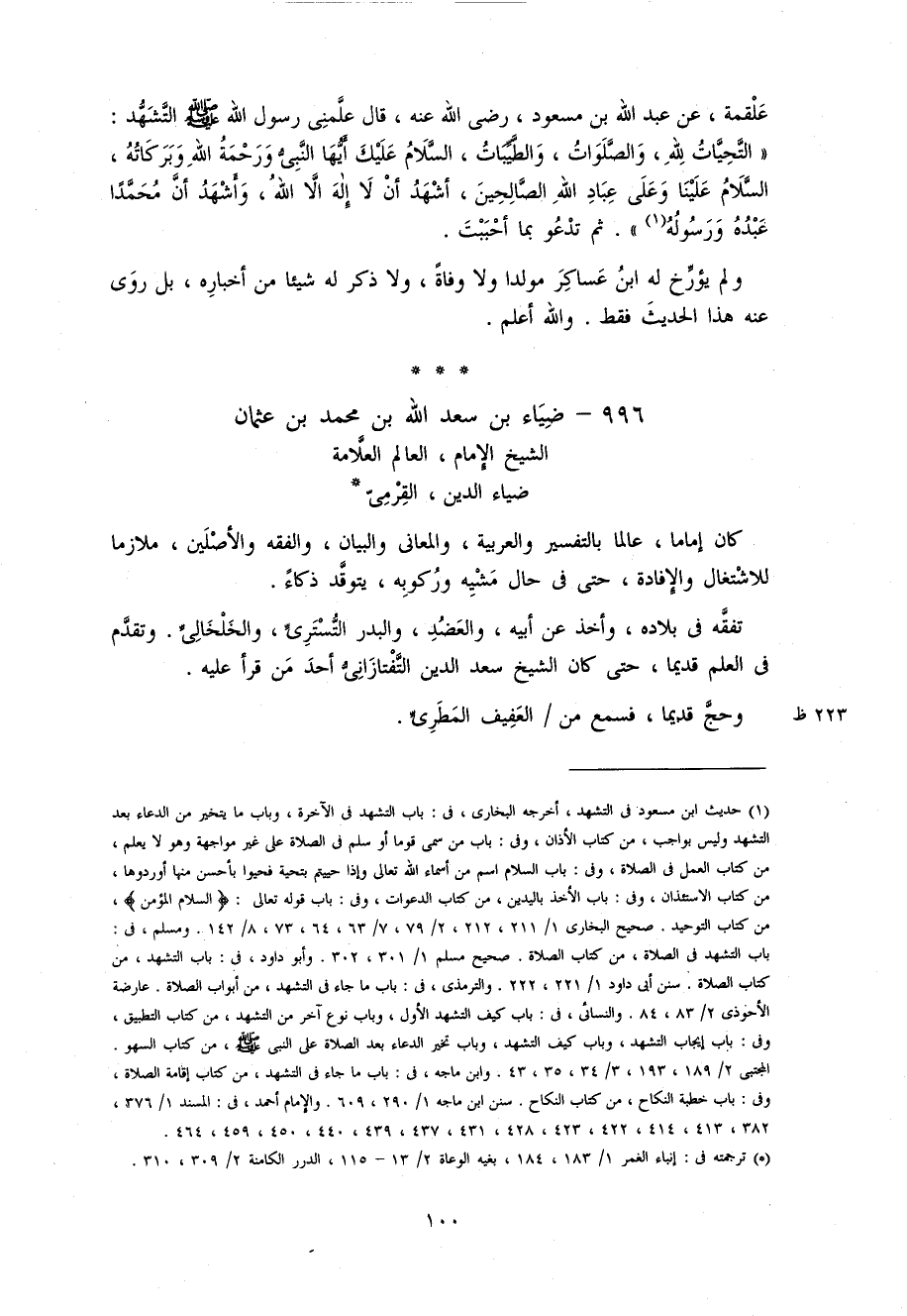1) حديث ابن مسعود فى التشهد، أخرجه البخارى، فى: باب التشهد فى الآخرة، و باب ما يتخير من الدعاء بعد التشهد و ليس بواجب، من كتاب الأذان، و فى: باب من سمى قوما أو سلم فى الصلاة على غير مواجهة و هو لا يعلم، من كتاب العمل فى الصلاة، و فى: باب السلام اسم من أسماء اللّه تعالى و إذا حييتم بتحية فحيوا بأحسن منها أوردوها، من كتاب الاستئذان، و فى: باب الأخذ باليدين، من كتاب الدعوات، و فى: باب قوله تعالى: اَلسَّلاامُ اَلْمُؤْمِنُ، من كتاب التوحيد. صحيح البخارى 1/ 211، 212، 2/ 79، 7/ 63، 64، 73، 8/ 142. و مسلم، فى: باب التشهد فى الصلاة، من كتاب الصلاة. صحيح مسلم 1/ 301، 302. و أبو داود، فى: باب التشهد، من كتاب الصلاة. سنن أبى داود 1/ 221، 222. و الترمذى، فى: باب ما جاء فى التشهد، من أبواب الصلاة. عارضة الأحوذى 2/ 83، 84. و النسائى، فى: باب كيف التشهد الأول، و باب نوع آخر من التشهد، من كتاب التطبيق، و فى: باب إيجاب التشهد، و باب كيف التشهد، و باب تخير الدعاء بعد الصلاة على النبى صلّى اللّه عليه و سلم، من كتاب السهو. المجتبى 2/ 189، 193، 3/ 34، 35، 43. و ابن ماجه، فى: باب ما جاء فى التشهد، من كتاب إقامة الصلاة، و فى: باب خطبة النكاح، من كتاب النكاح. سنن ابن ماجه 1/ 290، 609. و الإمام أحمد، فى: المسند 1/ 376، 382، 413، 414، 422، 423، 428، 431، 437، 439، 440، 450، 459، 464.