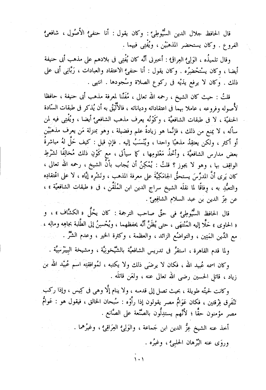 101 قال الحافظ جلال الدين السّيوطىّ: و كان يقول: أنا حنفىّ الأصول، شافعىّ الفروع. و كان يستحضر المذهبين، و يفتى فيهما.