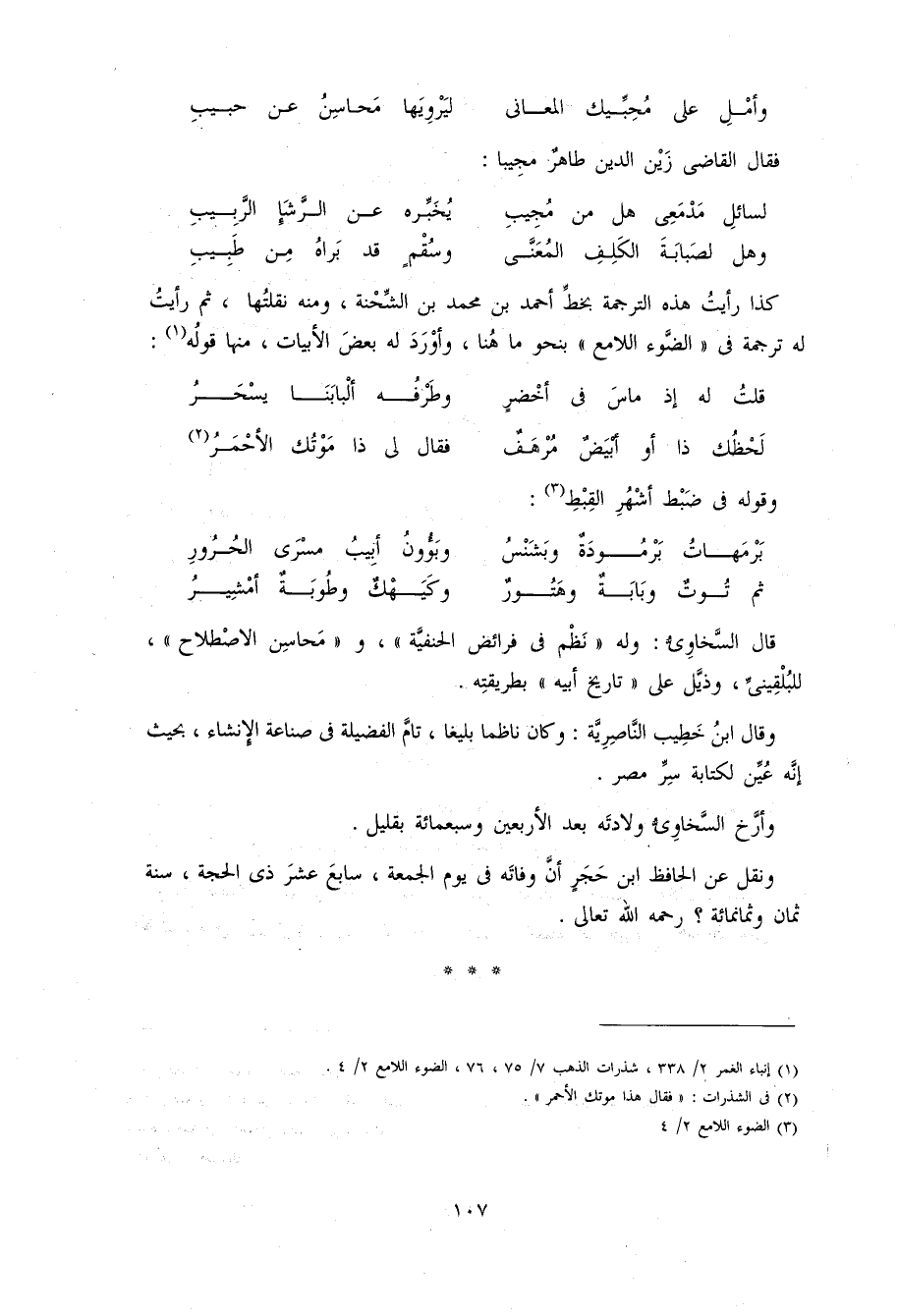 كذا رأيت هذه الترجمة بخطّ أحمد بن محمد بن الشّحنة، و منه نقلتها، ثم رأيت له ترجمة فى «الضّوء اللامع» بنحو ما هنا، و أورد له بعض الأبيات، منها قوله 1: