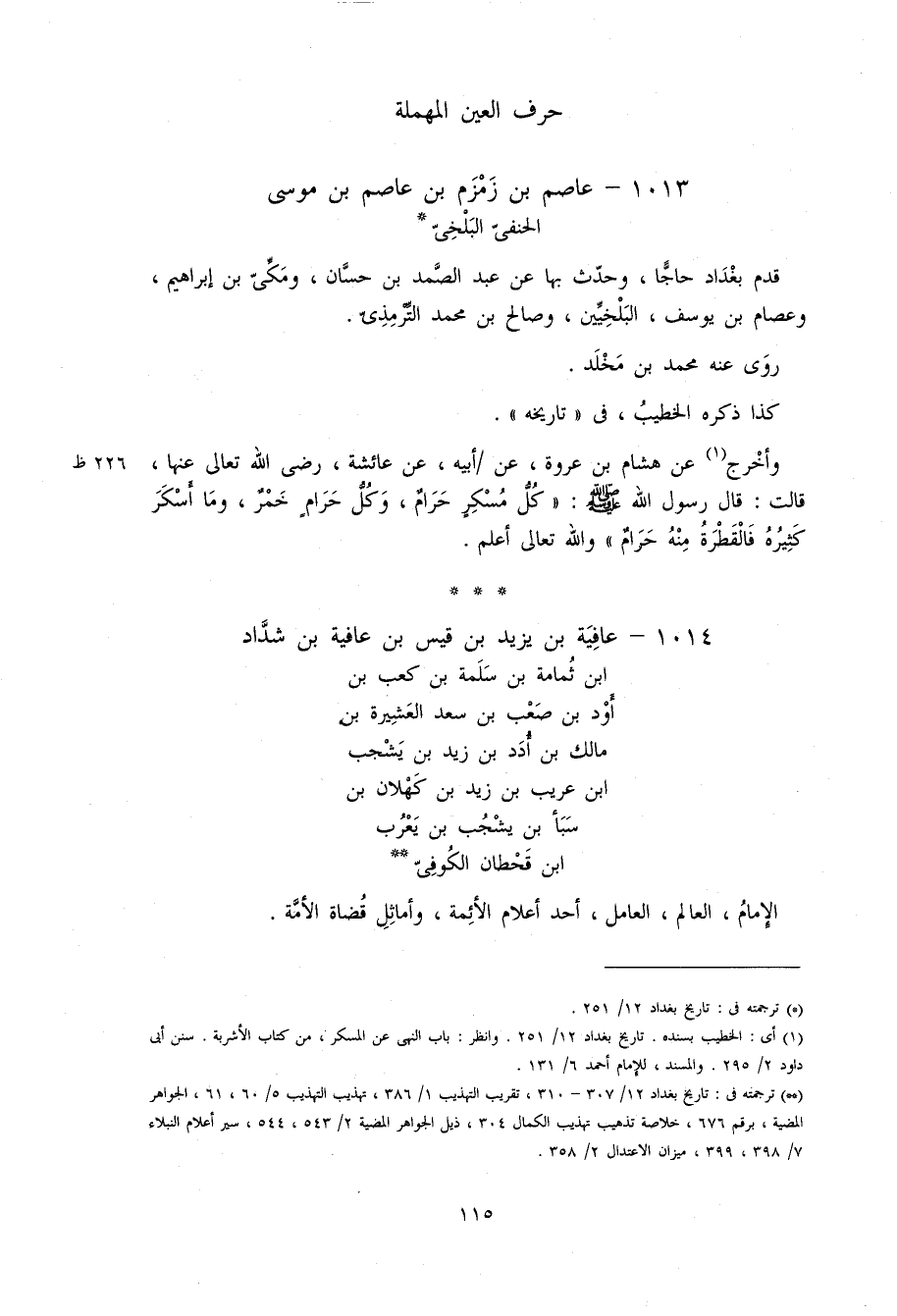 1014 - عافية بن يزيد بن قيس بن عافية بن شدّاد ابن ثمامة بن سلمة بن كعب بن أود بن صعب بن سعد العشيرة بن مالك بن أدد بن زيد بن يشجب ابن عريب بن زيد بن كهلان بن سبأ بن يشجب بن يعرب ابن قحطان الكوفىّ **