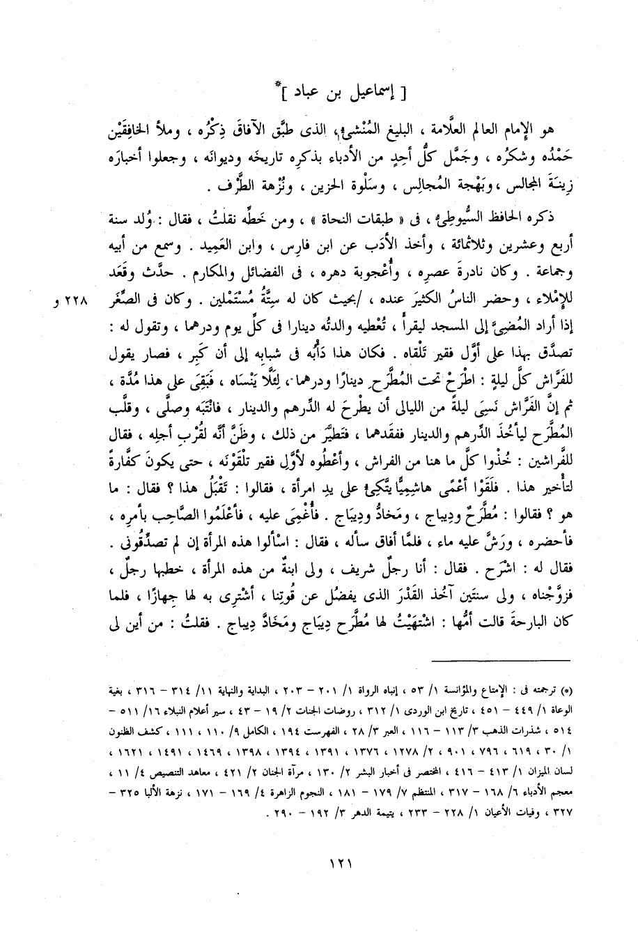 121 [إسماعيل بن عباد] *هو الإمام العالم العلاّمة، البليغ المنشئ، الذى طبّق الآفاق ذكره، و ملأ الخافقين حمده و شكره، و جمّل كلّ أحد من الأدباء بذكره تاريخه و ديوانه، و جعلوا أخباره زينة المجالس، و بهجة المجالس، و سلوة الحزين، و نزهة الطّرف.