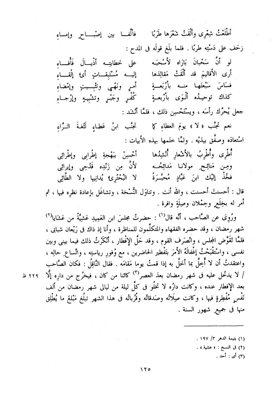 و روى عن الصّاحب، أنّه قال 1: حضرت مجلس ابن العميد عشيّة من عشايا 2 شهر رمضان، و قد حضره الفقهاء و المتكلّمون للمناظرة، و أنا إذ ذاك فى ريعان شبابى، فلمّا تقوّض المجلس، و انصرف القوم، و قد حلّ الإفطار، أنكرت ذلك فيما بينى و بين نفسى، و استقبحت إغفاله الأمر بتفطير الحاضرين، مع وفور رياسته، و اتّساع حاله، و اعتقدت أن لا أخلّ بما أخلّ به إذا قمت يوما مقامه. فقال النّاقل: فكان الصّاحب /لا يدخل عليه فى شهر رمضان بعد العصر 3 كائنا من كان، فيخرج من داره إلاّ بعد الإفطار عنده، و كانت داره لا تخلو فى كلّ ليلة من ليالى شهر رمضان من ألف نفس مفطرة فيها، و كانت صلاته و صدقاته و قرباته فى هذا الشهر تبلغ مبلغ ما يطلق منها فى جميع شهور السنة.