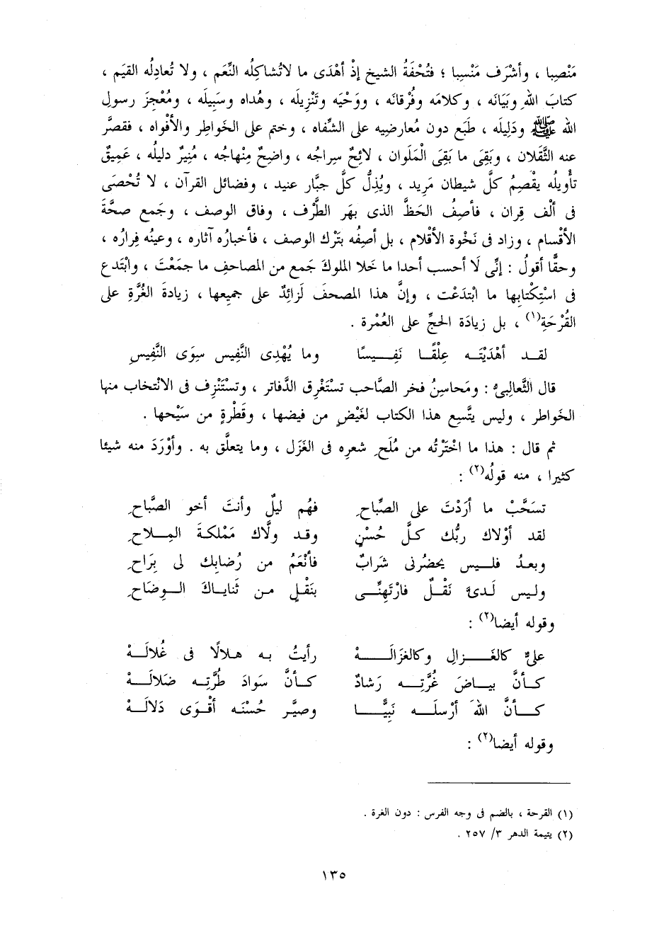 135 منصبا، و أشرف منسبا؛ فتحفة الشيخ إذ أهدى ما لا تشاكله النّعم، و لا تعادله القيم، كتاب اللّه و بيانه، و كلامه و فرقانه، و وحيه و تنزيله، و هداه و سبيله، و معجز رسول اللّه صلّى اللّه عليه و سلم و دليله، طبع دون معارضيه على الشّفاه، و ختم على الخواطر و الأفواه، فقصّر عنه الثّقلان، و بقى ما بقى الملوان، لائح سراجه، واضح منهاجه، منير دليله، عميق تأويله يقصم كلّ شيطان مريد، و يذلّ كلّ جبّار عنيد، و فضائل القرآن، لا تحصى فى ألف قران، فأصف الحظّ الذى بهر الطّرف، وفاق الوصف، و جمع صحّة الأقسام، و زاد فى نخوة الأقلام، بل أصفه بترك الوصف، فأخباره آثاره، و عينه فراره، و حقّا أقول: إنّى لا أحسب أحدا ما خلا الملوك جمع من المصاحف ما جمعت، و ابتدع فى استكتابها ما ابتدعت، و إنّ هذا المصحف لزائد على جميعها، زيادة الغرّة على القرحة 1، بل زيادة الحجّ على العمرة.