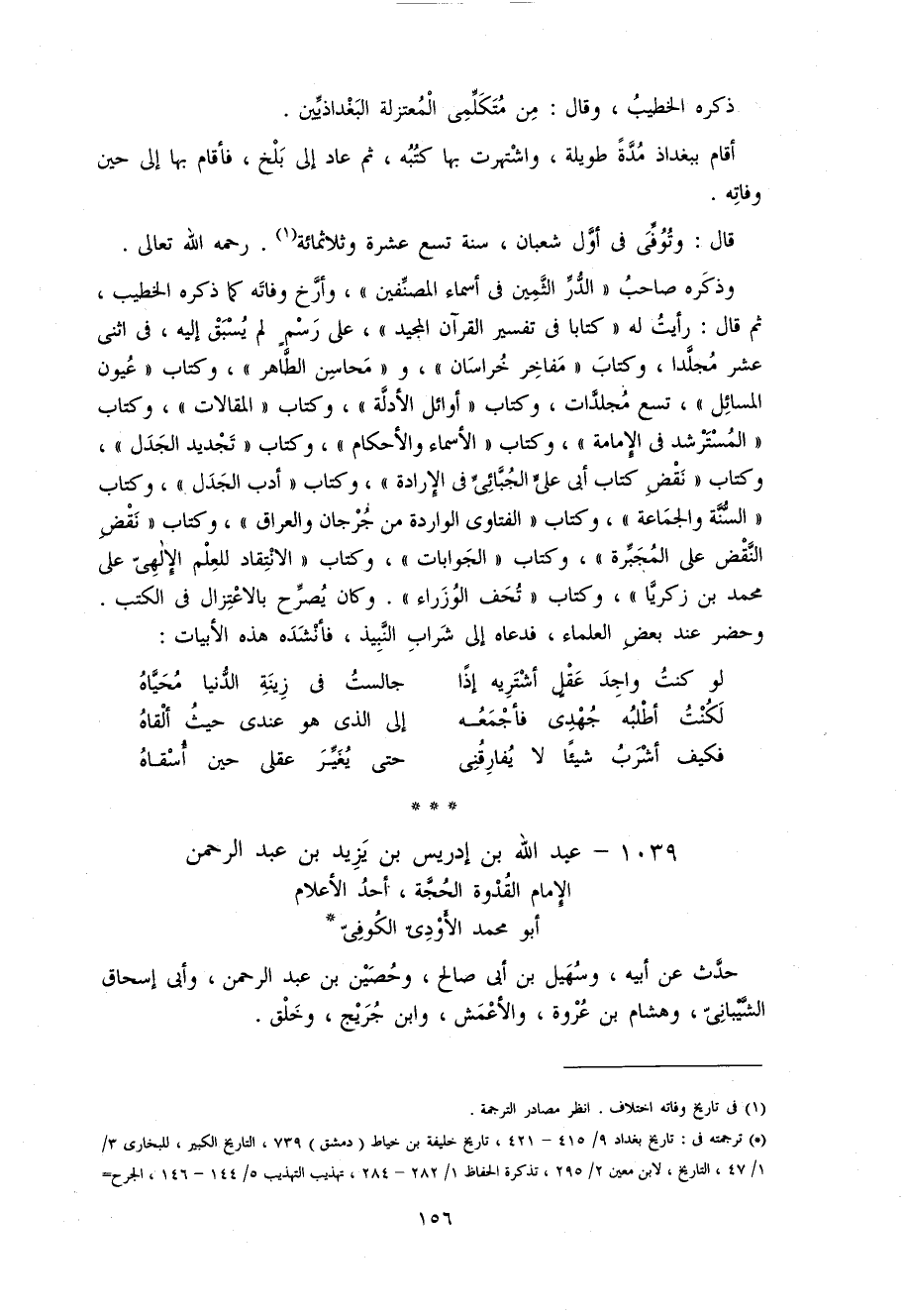 156 ذكره الخطيب، و قال: من متكلّمى المعتزلة البغداذيّين.