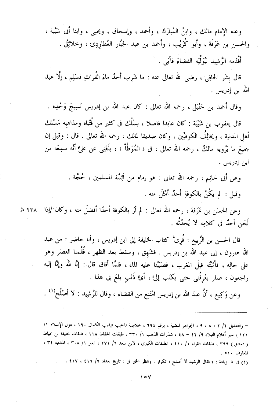 قال بشر الحافى، رضى اللّه تعالى عنه: ما شرب أحد ماء الفرات فسلم، إلاّ عبد اللّه بن إدريس.