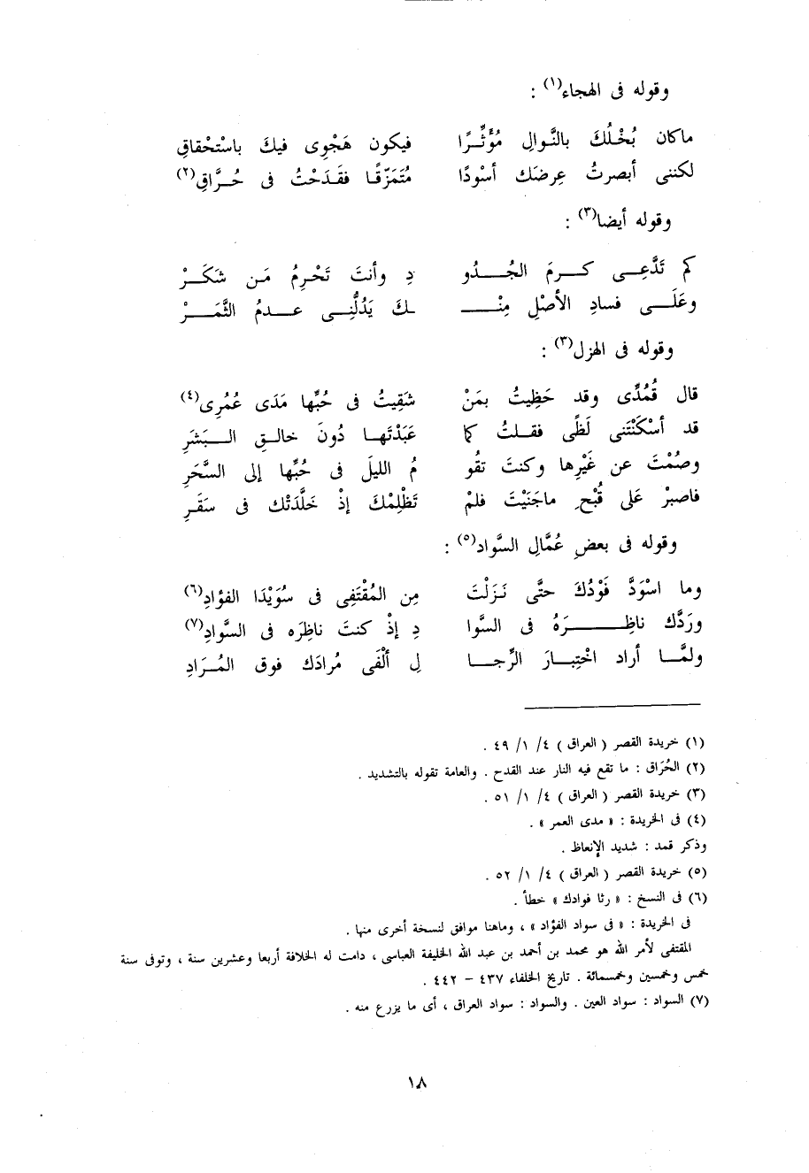 6) فى النسخ: «رثا فوادك» خطأ. فى الخريدة: «فى سواد الفؤاد»، و ما هنا موافق لنسخة أخرى منها. المقتفى لأمر اللّه هو محمد بن أحمد بن عبد اللّه الخليفة العباسى، دامت له الخلافة أربعا و عشرين سنة، و توفى سنة خمس و خمسين و خمسمائة. تاريخ الخلفاء 437 - 442.