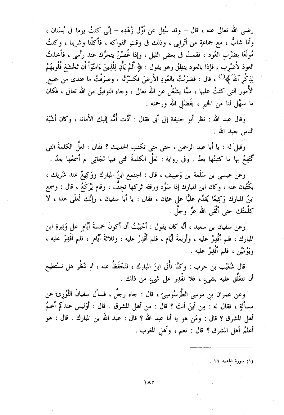 185 رضى اللّه تعالى عنه، قال-و قد سئل عن أوّل زهده-إنّى كنت يوما فى بستان، و أنا شابّ، مع جماعة من أترابى، و ذلك فى وقت الفواكه، فأكلنا و شربنا، و كنت مولعا بضرب العود، فقمت فى بعض الليل، و إذا غصن يتحرّك عند رأسى، فأخذت العود لأضرب، فإذا بالعود ينطق و هو يقول: أَ لَمْ يَأْنِ لِلَّذِينَ آمَنُوا أَنْ تَخْشَعَ قُلُوبُهُمْ لِذِكْرِ اَللّاهِ 1، قال: فضربت بالعود الأرض فكسرته، و صرفت ما عندى من جميع الأمور التى كنت عليها، ممّا يشغل عن اللّه تعالى، و جاء التوفيق من اللّه تعالى، فكان ما سهّل لنا من الخير، بفضل اللّه و رحمته.