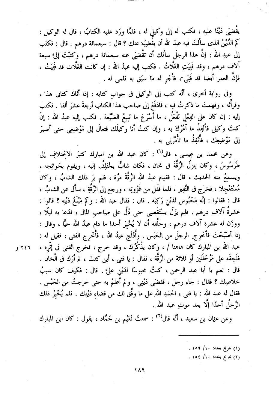 و عن محمد بن عيسى، قال 1: كان عبد اللّه بن المبارك كثير الاختلاف إلى طرسوس، و كان ينزل الرّقّة فى خان، فكان شابّ يختلف إليه، و يقوم بحوائجه، و يسمع منه الحديث، قال: فقدم عبد اللّه الرّقّة مرّة، فلم ير ذلك الشابّ، و كان مستعجلا، فخرج فى النّفير، فلما قفل من غزوته، و رجع إلى الرّقّة، سأل عن الشابّ، قال: فقالوا: إنّه محبوس لدين ركبه. قال: فقال عبد اللّه: و كم مبلغ دينه؟ قالوا: