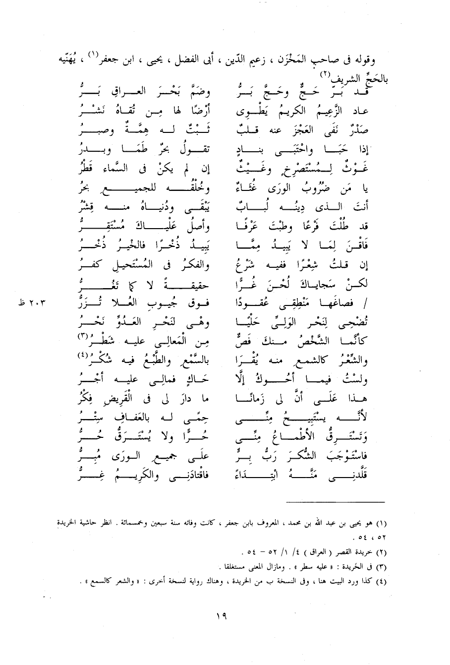 19 و قوله فى صاحب المخزن، زعيم الدّين، أبى الفضل، يحيى، ابن جعفر 1، يهنّيه بالحجّ الشريف 2
