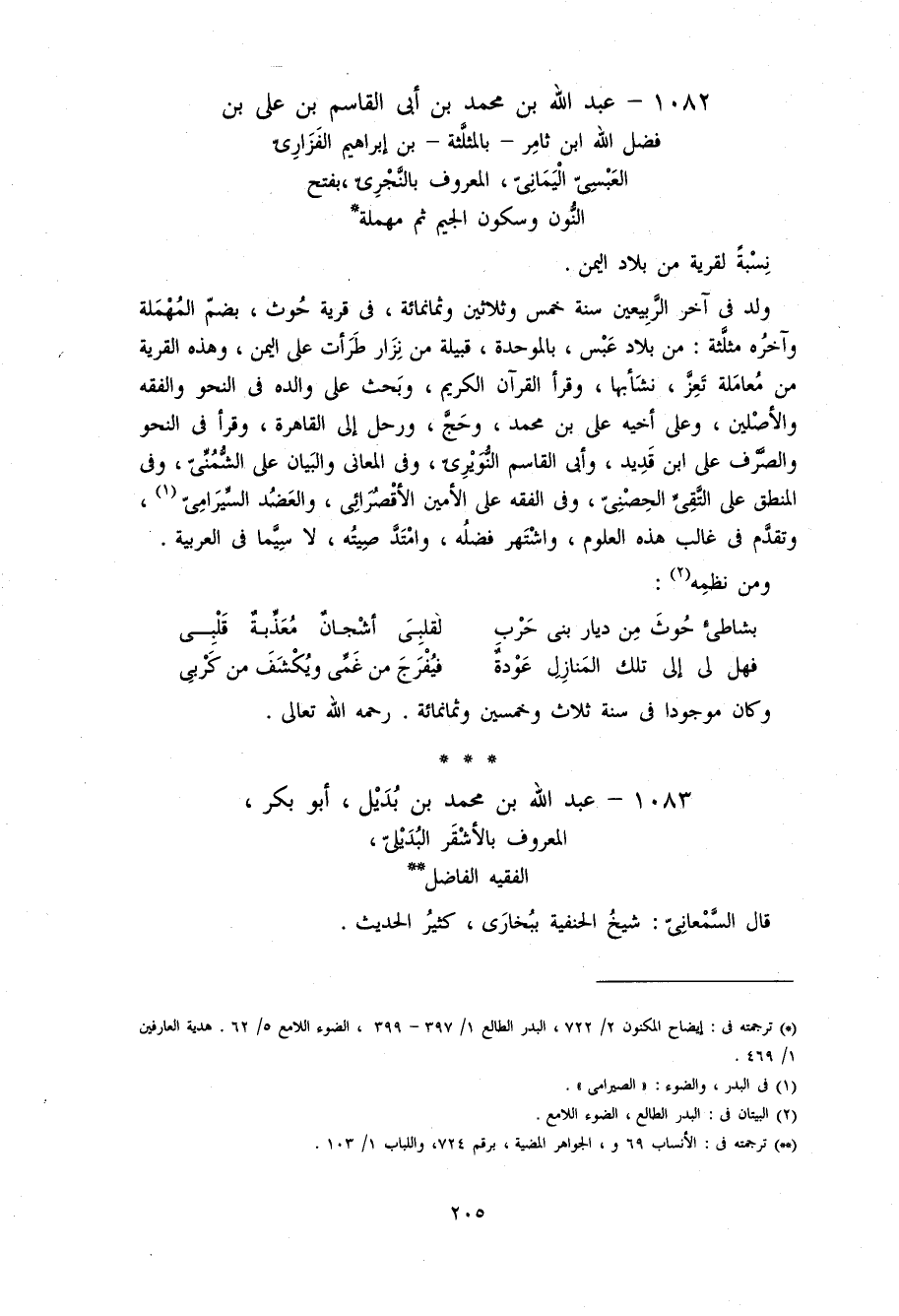1082 - عبد اللّه بن محمد بن أبى القاسم بن على بن فضل اللّه ابن ثامر-بالمثلّثة-بن إبراهيم الفزارىّ العبسىّ اليمانىّ، المعروف بالنّجرىّ، بفتح النّون و سكون الجيم ثم مهملة *