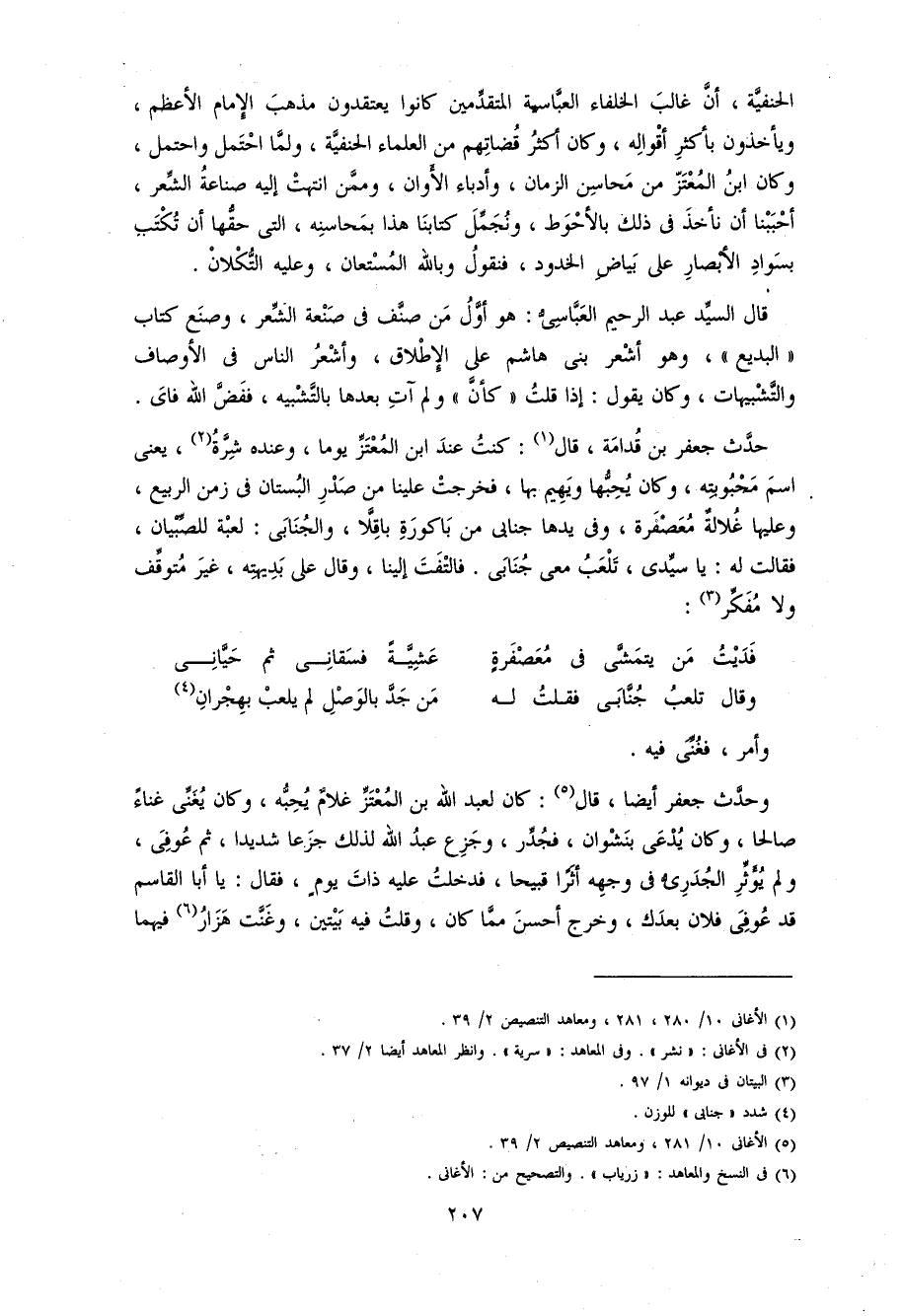 207 الحنفيّة، أنّ غالب الخلفاء العبّاسية المتقدّمين كانوا يعتقدون مذهب الإمام الأعظم، و يأخذون بأكثر أقواله، و كان أكثر قضاتهم من العلماء الحنفيّة، و لمّا احتمل و احتمل، و كان ابن المعتزّ من محاسن الزمان، و أدباء الأوان، و ممّن انتهت إليه صناعة الشّعر، أحببنا أن نأخذ فى ذلك بالأحوط، و نجمّل كتابنا هذا بمحاسنه، التى حقّها أن تكتب بسواد الأبصار على بياض الخدود، فنقول و باللّه المستعان، و عليه التّكلان.