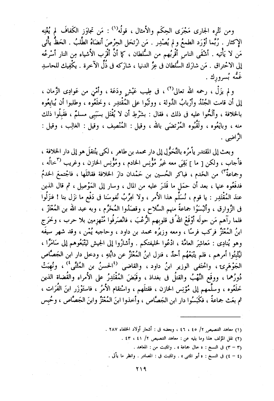 و بعث إلى المقتدر يأمره بالتّحوّل إلى دار محمد بن طاهر، لكى ينتقل هو إلى دار الخلافة، فأجاب، و لكن [ما] بقى معه غير مؤنس الخادم، و مؤنس الخازن، و غريب 3 خاله، و جماعة 3 من الخدم، فباكر الحسين بن حمدان دار الخلافة فقاتلها، فاجتمع الخدم فدفعوه عنها، بعد أن حمل ما قدر عليه من المال، و سار إلى الموصل، ثم قال الذين عند المقتدر: يا قوم، نسلّم هذا الأمر، و لا نجرّب نفوسنا فى دفع ما نزل بنا! فنزلوا فى الزّوارق، و ألبسوا جماعة منهم السّلاح، و قصدوا المخرّم، و به عبد اللّه بن المعتزّ، فلما رآهم من حوله أوقع اللّه فى قلوبهم الرّعب، فانصرفوا منهزمين بلا حرب، و خرج ابن المعتزّ فركب فرسا، و معه وزيره محمد بن داود، و حاجبه يمن، و قد شهر سيفه و هو ينادى: معاشر العامّة، ادعوا لخليفتكم. و أشاروا إلى الجيش ليتبعوهم إلى سامرّا، ليثبتوا أمرهم، فلم يتبعهم أحد، فنزل ابن المعتزّ عن دابّته، و دخل دار ابن الجصّاص الجوهرىّ، و اختفى الوزير ابن داود، و القاضى 4 الحسن بن المثنّى 4، و نهبت دورهما، و وقع النّهب و القتل فى بغداذ، و قبض المقتدر على الأمراء و القضاة الذين خلعوه، و سلّمهم إلى مؤنس الخازن، فقتلهم، و استقام الأمر، فاستوزر ابن الفرات، ثم بعث جماعة، فكبسوا دار ابن الجصّاص، و أخذوا ابن المعتزّ و ابن الجصّاص، و حبس
