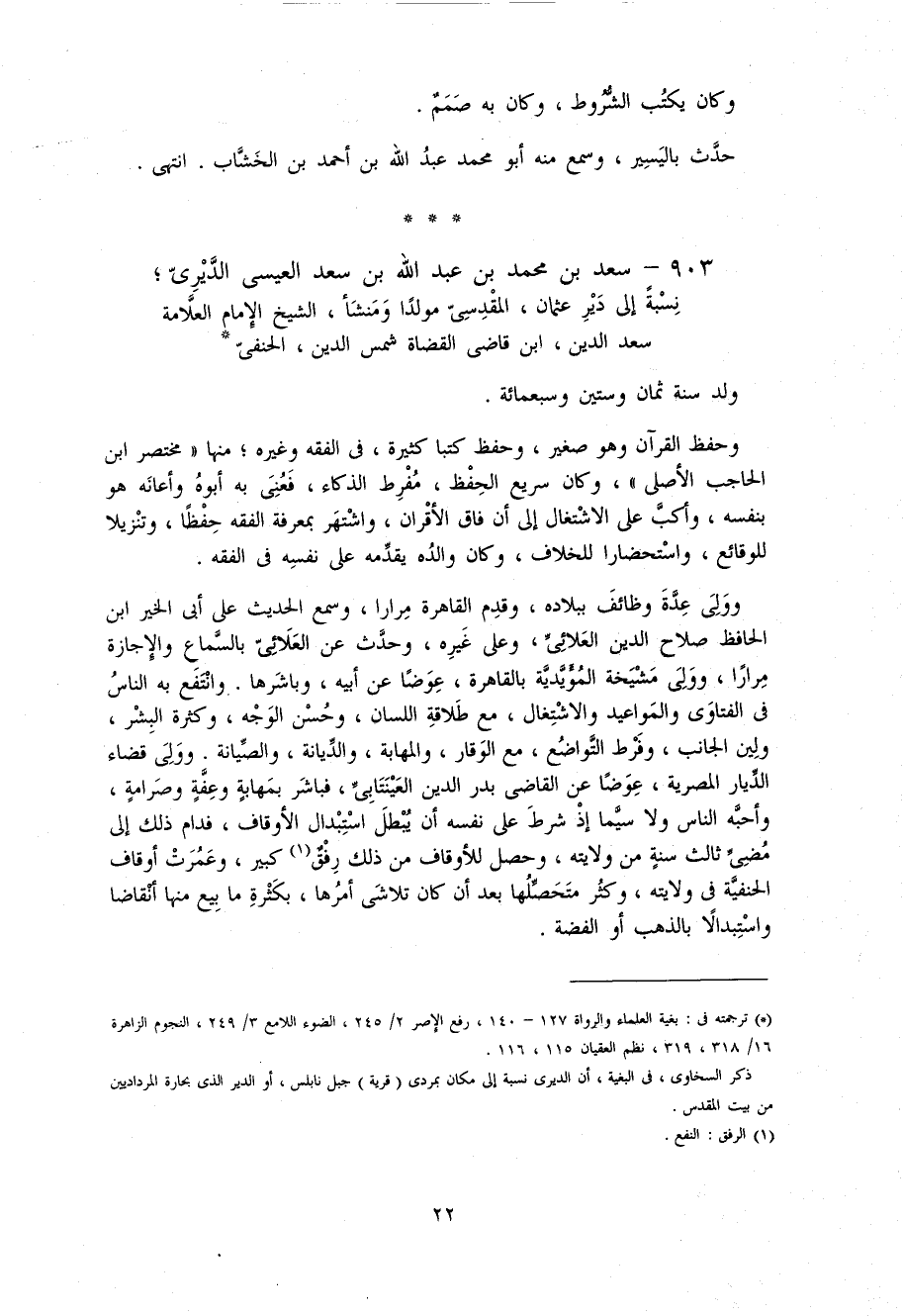 903 - سعد بن محمد بن عبد اللّه بن سعد العيسى الدّيرىّ؛ نسبة إلى دير عثمان، المقدسىّ مولدا و منشأ، الشيخ الإمام العلاّمة سعد الدين، ابن قاضى القضاة شمس الدين، الحنفىّ *