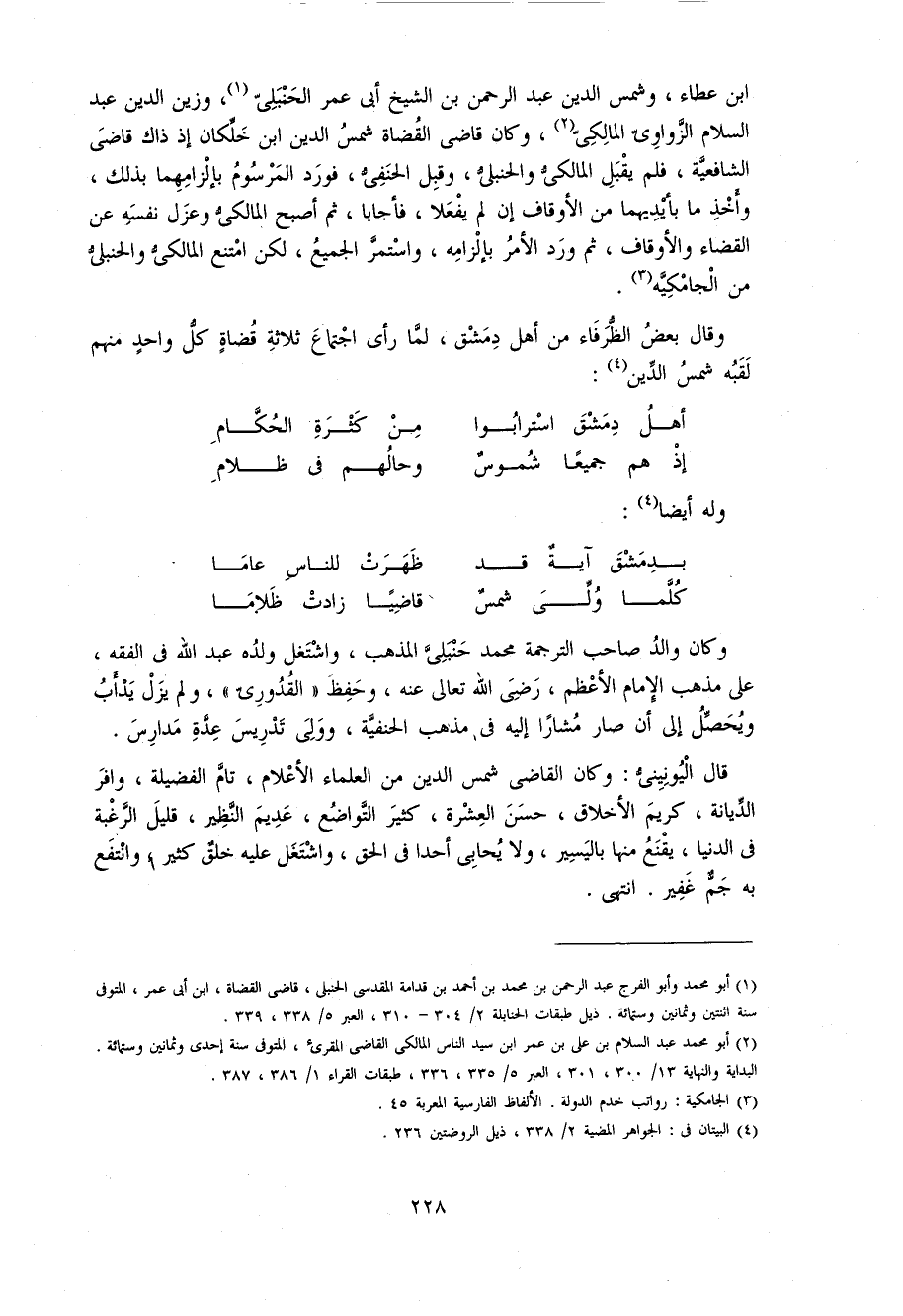 و قال بعض الظّرفاء من أهل دمشق، لمّا رأى اجتماع ثلاثة قضاة كلّ واحد منهم لقبه شمس الدّين 4: