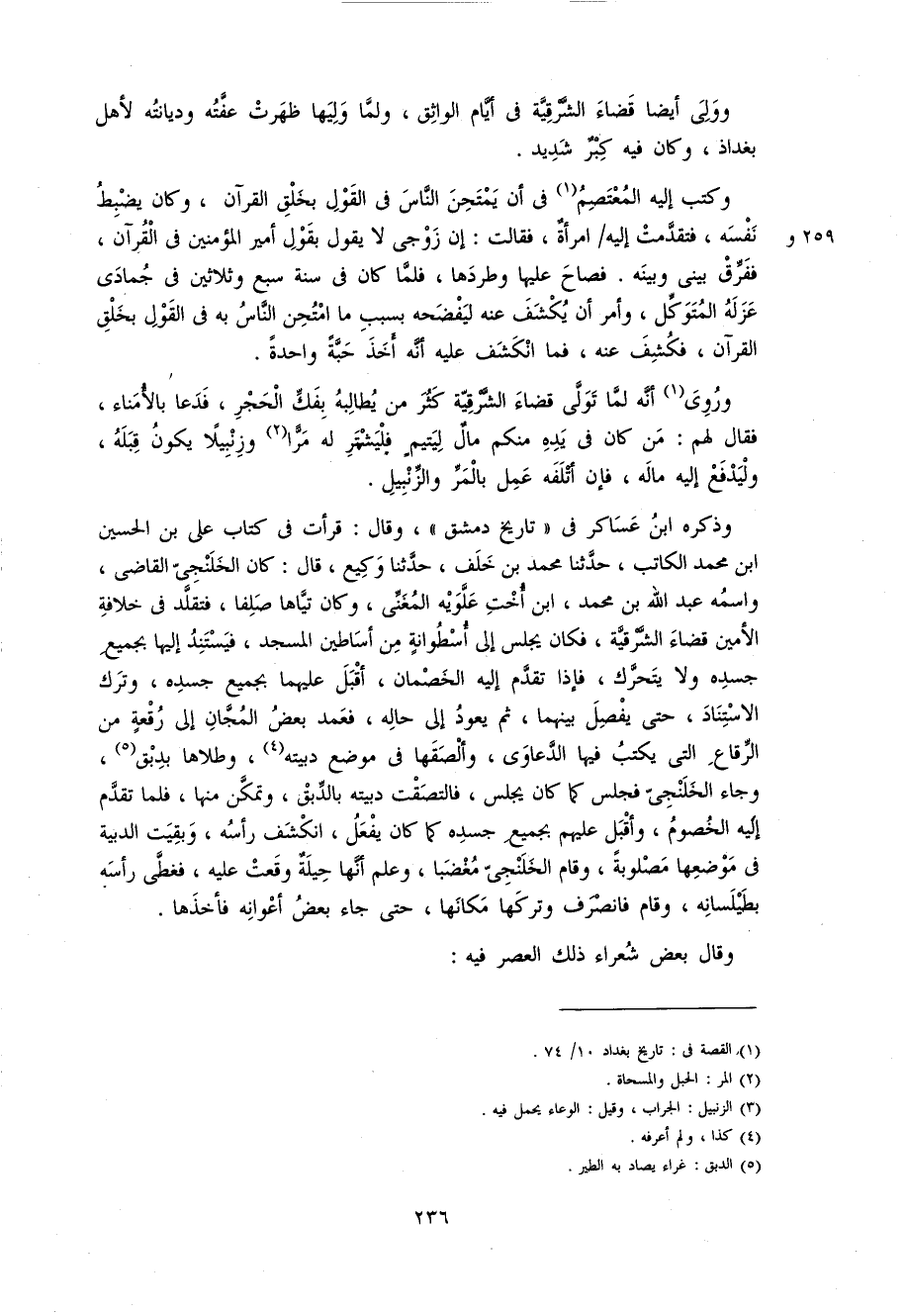 236 و ولى أيضا قضاء الشّرقيّة فى أيّام الواثق، و لمّا وليها ظهرت عفّته و ديانته لأهل بغداذ، و كان فيه كبر شديد.