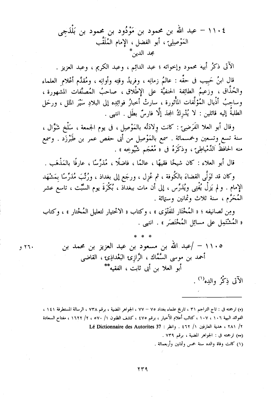 *) ترجمته فى: تاج التراجم 31، تاريخ علماء بغداد 75 - 77، الجواهر المضية، برقم 738، الرسالة المستطرفة 141، الفوائد البهية 106، 107، كتائب أعلام الأخيار، برقم 475، كشف الظنون 1/ 570، 2/ 1622، مفتاح السعادة 2/ 281، هدية العارفين 1/ 462. و انظر: 73 setirotuA sed eriannoitciD eL