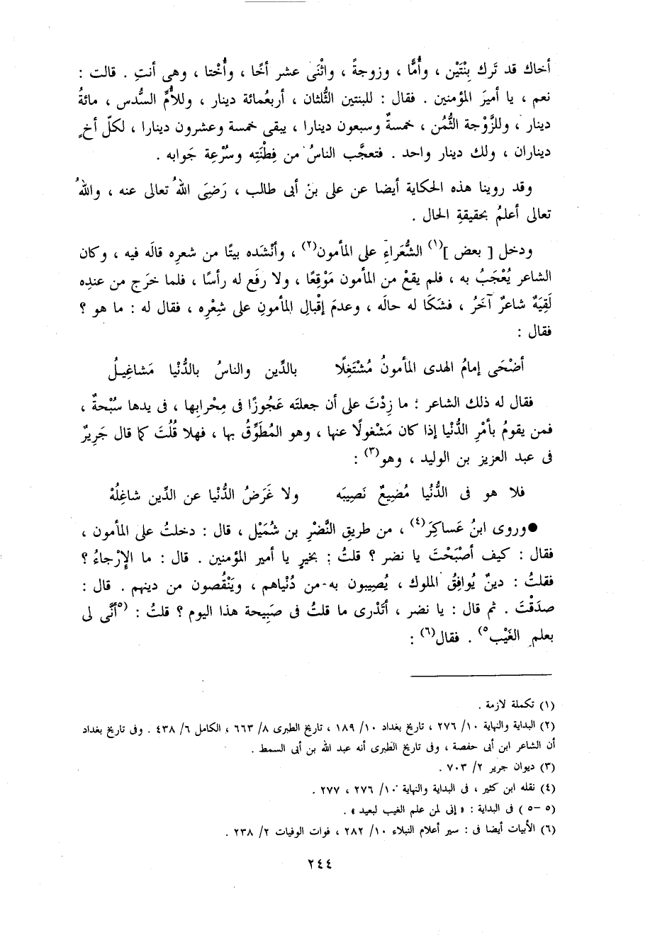 2) البداية و النهاية 10/ 276، تاريخ بغداد 10/ 189، تاريخ الطبرى 8/ 663، الكامل 6/ 438. و فى تاريخ بغداد أن الشاعر ابن أبى حفصة، و فى تاريخ الطبرى أنه عبد اللّه بن أبى السمط.
