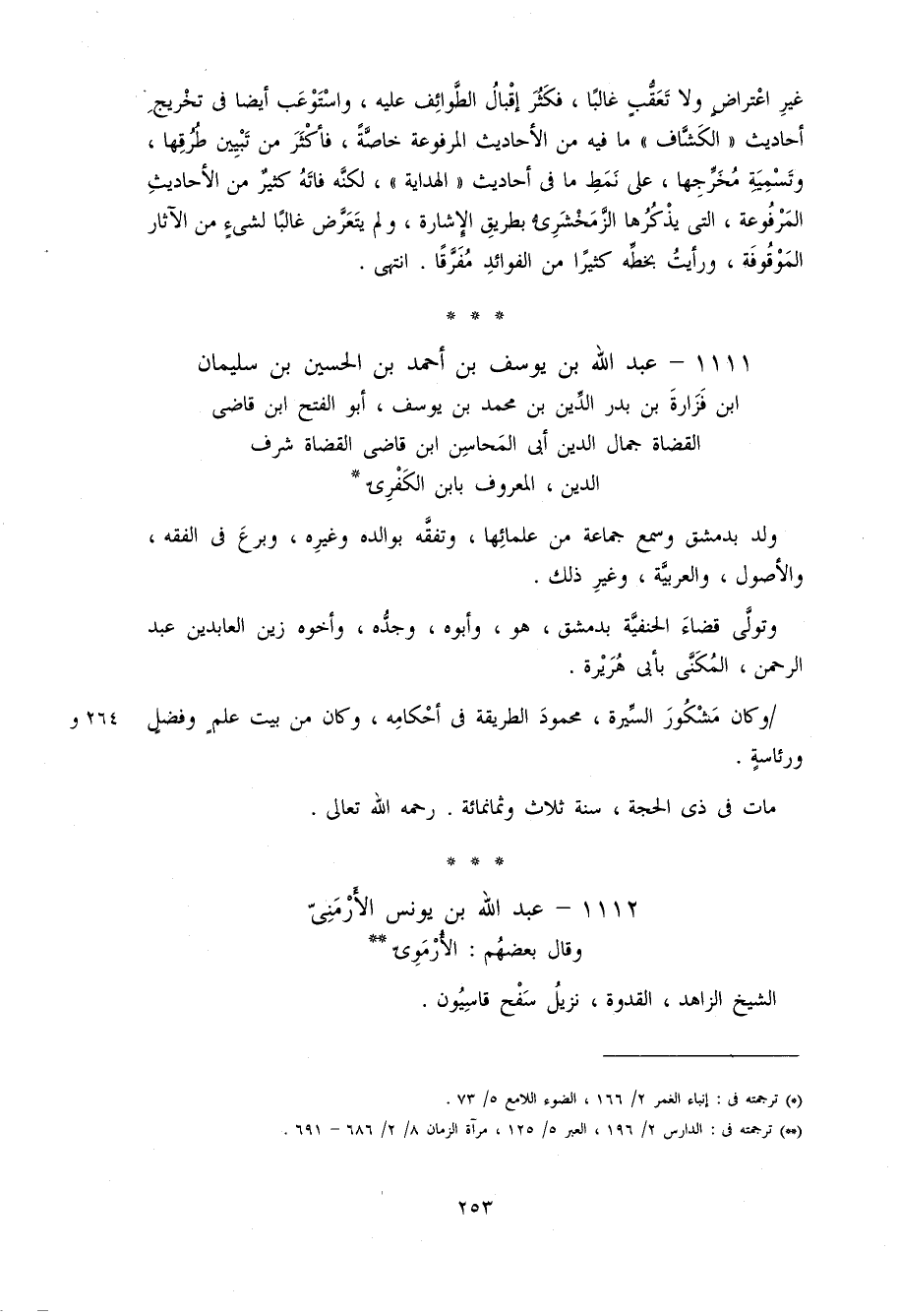 253 غير اعتراض و لا تعقّب غالبا، فكثر إقبال الطّوائف عليه، و استوعب أيضا فى تخريج أحاديث «الكشّاف» ما فيه من الأحاديث المرفوعة خاصّة، فأكثر من تبيين طرقها، و تسمية مخرّجها، على نمط ما فى أحاديث «الهداية»، لكنّه فاته كثير من الأحاديث المرفوعة، التى يذكرها الزّمخشرىّ بطريق الإشارة، و لم يتعرّض غالبا لشاء من الآثار الموقوفة، و رأيت بخطّه كثيرا من الفوائد مفرّقا. انتهى.