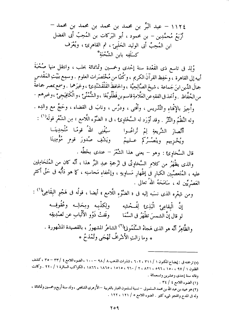 1124 - عبد البرّ بن محمد بن محمد بن محمد بن محمد- أربع محمّدين-بن محمود، أبو البركات بن المحبّ أبى الفضل ابن المحبّ أبى الوليد الحلبىّ، ثم القاهرىّ، و يعرف كسلفه بابن الشّحنة *
