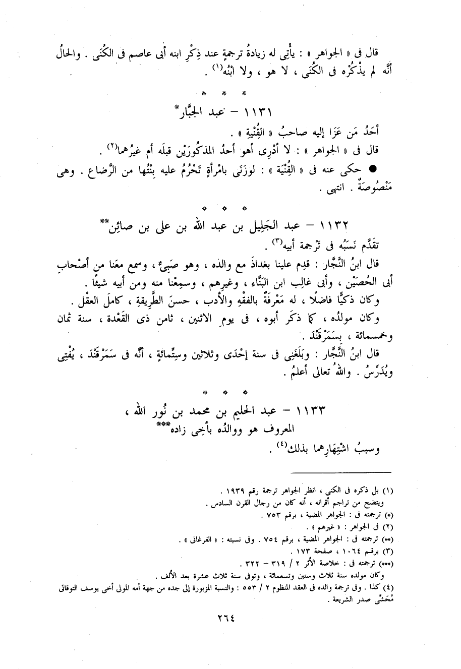 1) بل ذكره فى الكنى، انظر الجواهر ترجمة رقم 1939. و يتضح من تراجم أقرانه، أنه كان من رجال القرن السادس.