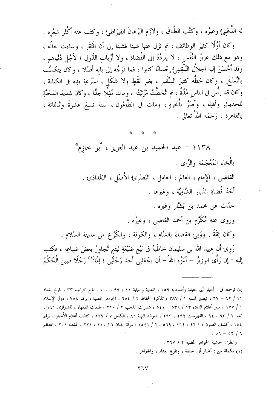 *) ترجمته فى: أخبار أبى حنيفة و أصحابه 159، البداية و النهاية 11/ 99، 100، تاج التراجم 33، تاريخ بغداد 11/ 62 - 67، تبصير المنتبه 1/ 387، تذكرة الحفاظ 2/ 654، الجواهر المضية، برقم 758، دول الإسلام 1/ 177، سير أعلام النبلاء 13/ 539 - 541، شذرات الذهب 2/ 210، طبقات الفقهاء، للشيرازى 141، العبر 2/ 93، 94، الفهرست 292، 293، الفوائد البهية 86، الكامل 7/ 537، كتائب أعلام الأخيار، برقم 144، كشف الظنون 1/ 46، 164، 569، 2/ 1541، مرآة الجنان 2/ 220، 221، المشتبه 201، المنتظم 6/ 52 - 56. و انظر: حاشية الجواهر المضية 2/ 367.