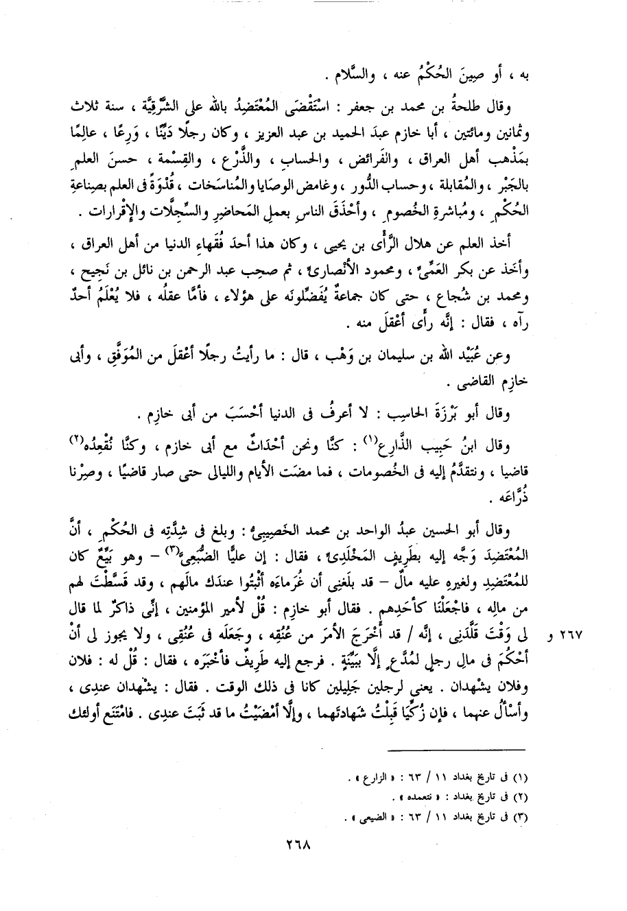 و قال طلحة بن محمد بن جعفر: استقضى المعتضد باللّه على الشّرقيّة، سنة ثلاث و ثمانين و مائتين، أبا خازم عبد الحميد بن عبد العزيز، و كان رجلا ديّنا، ورعا، عالما بمذهب أهل العراق، و الفرائض، و الحساب، و الذّرع، و القسمة، حسن العلم بالجبر، و المقابلة، و حساب الدّور، و غامض الوصايا و المناسخات، قدوة فى العلم بصناعة الحكم، و مباشرة الخصوم، و أحذق الناس بعمل المحاضر و السّجلاّت و الإقرارات.