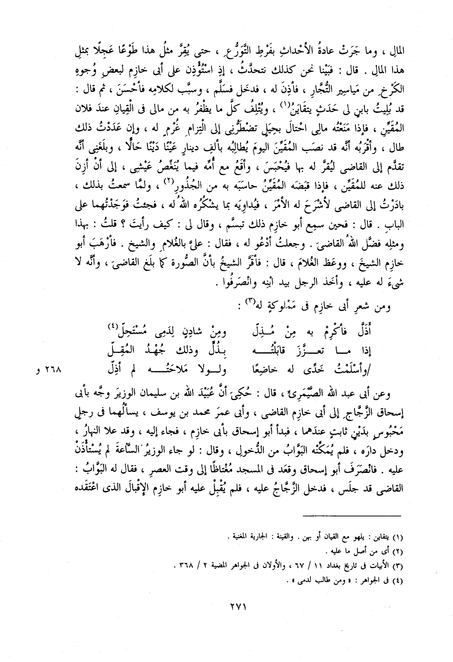 271 المال، و ما جرت عادة الأحداث بفرط التّورّع، حتى يقرّ مثل هذا طوعا عجلا بمثل هذا المال. قال: فبينا نحن كذلك نتحدّث، إذ استؤذن على أبى خازم لبعض وجوه الكرخ من مياسير التّجّار، فأذن له، فدخل فسلّم، و سبّب لكلامه فأحسن، ثم قال: