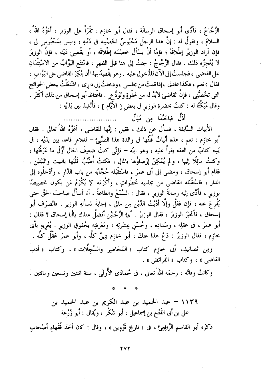 272 الزّجّاج، فأدّى أبو إسحاق الرسالة، فقال أبو خازم: تقرأ على الوزير، أعزّه اللّه، السلام، و تقول له: إنّ هذا الرجل محبوس لخصمه فى دينه، و ليس بمحبوس لى، فإن أراد الوزير إطلاقه؛ فإمّا أن يسأل خصمه إطلاقه، أو يقضى دينه، فإنّ الوزير لا يعجزه ذلك. فقال الزّجّاج: جئت إلى هنا قبل الظهر، فامتنع البوّاب من الاستئذان على القاضى، فجلست إلى الآن للدّخول عليه. و هو يقصد بهذا أن ينكر القاضى على البوّاب، فقال: نعم، هكذا عادتى، إذا قمت من مجلسى، و دخلت إلى دارى، اشتغلت ببعض الحوائج التى تخصّنى، فإنّ القاضى لا بدّ له من خلوة و تودّع. فاغتاظ أبو إسحاق من ذلك أكثر، و قال مبكّتا له: كنت بحضرة الوزير فى بعض [الأيّام]، فأنشد بين يديه: