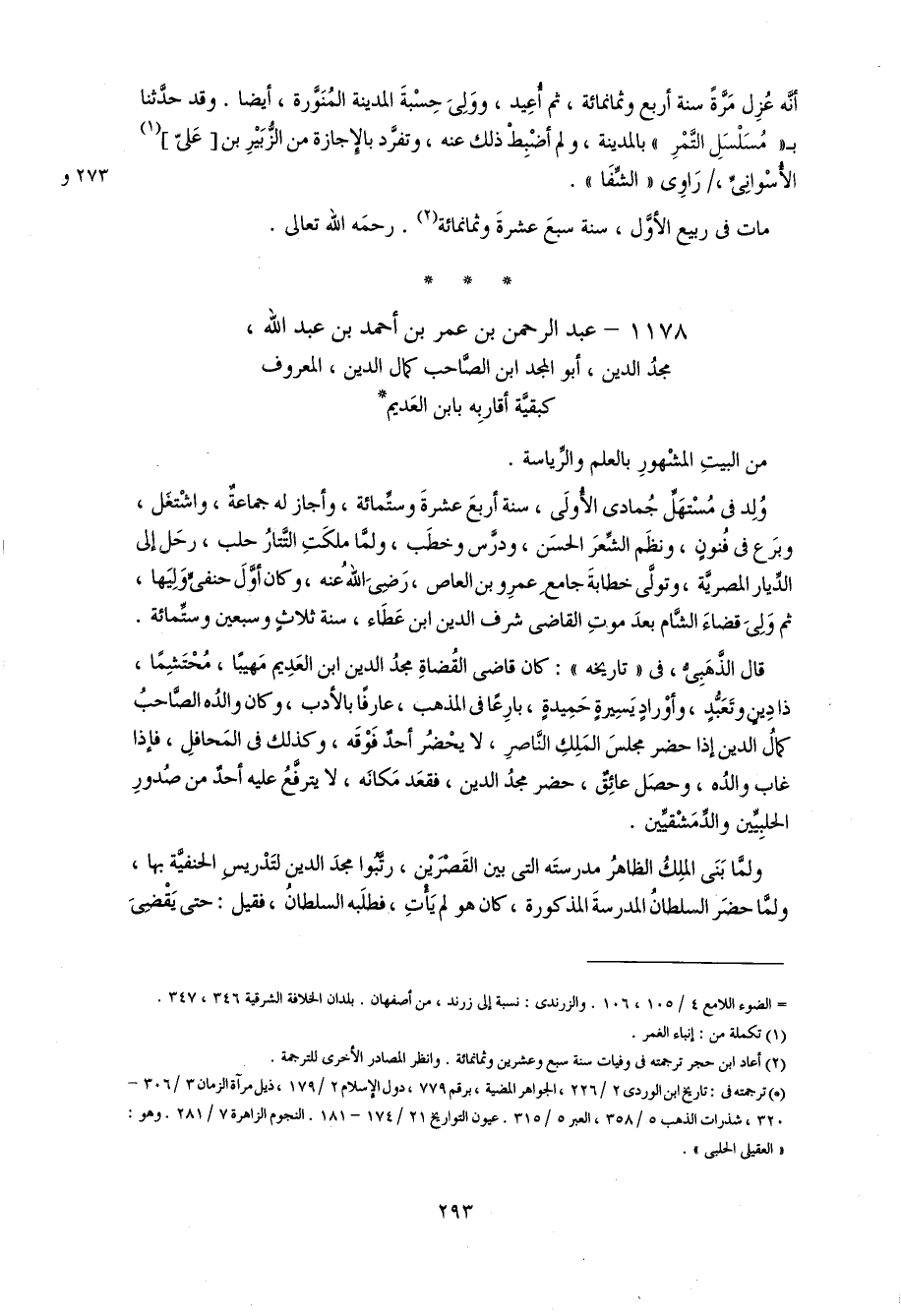 1178 - عبد الرحمن بن عمر بن أحمد بن عبد اللّه، مجد الدين، أبو المجد ابن الصّاحب كمال الدين، المعروف كبقيّة أقاربه بابن العديم *