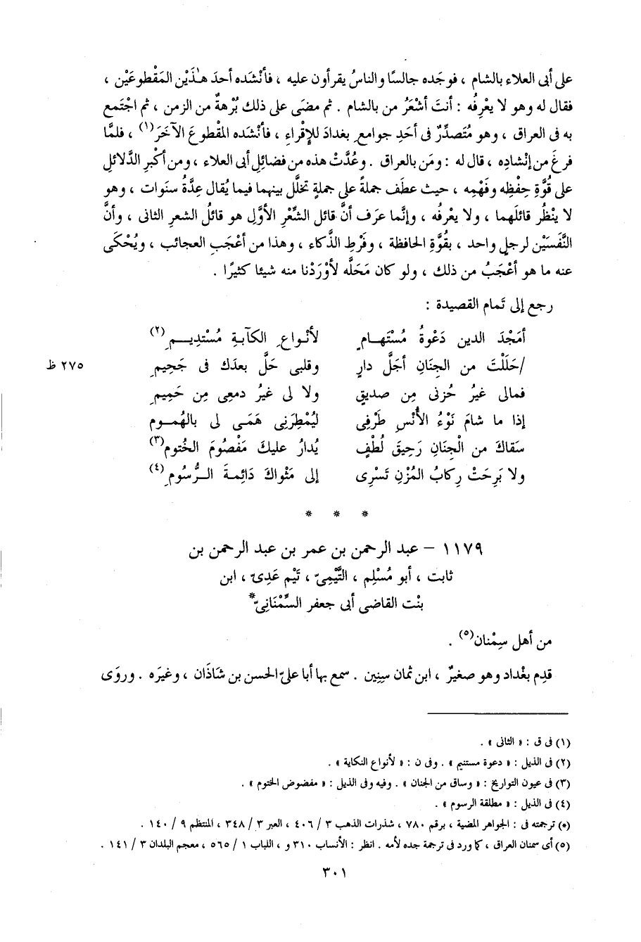 1179 - عبد الرحمن بن عمر بن عبد الرحمن بن ثابت، أبو مسلم، التّيمىّ، تيم عدىّ، ابن بنت القاضى أبى جعفر السّمنانىّ *