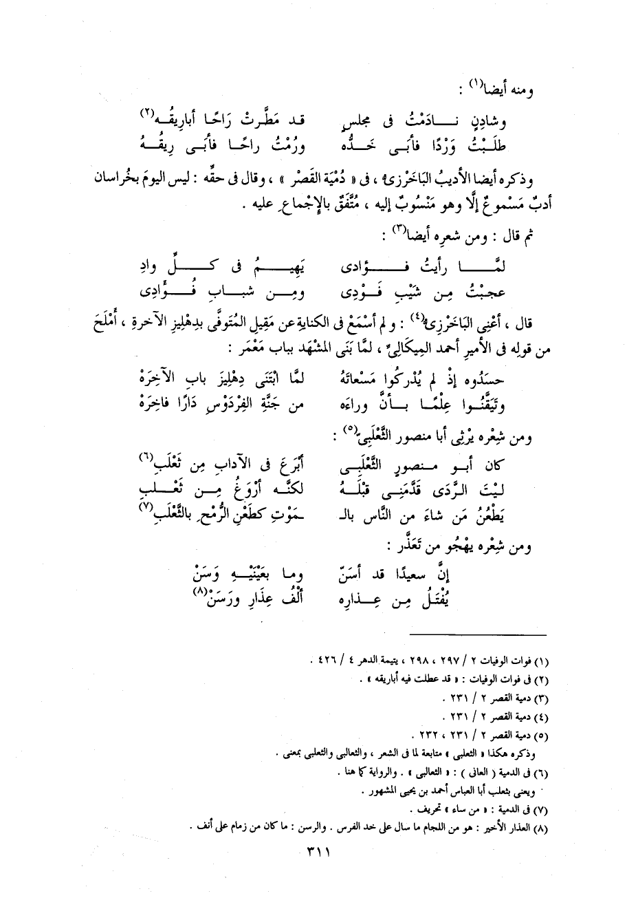 5) دمية القصر 2/ 231، 232. و ذكره هكذا «الثعلبى» متابعة لما فى الشعر، و الثعالبى و الثعلبى بمعنى.