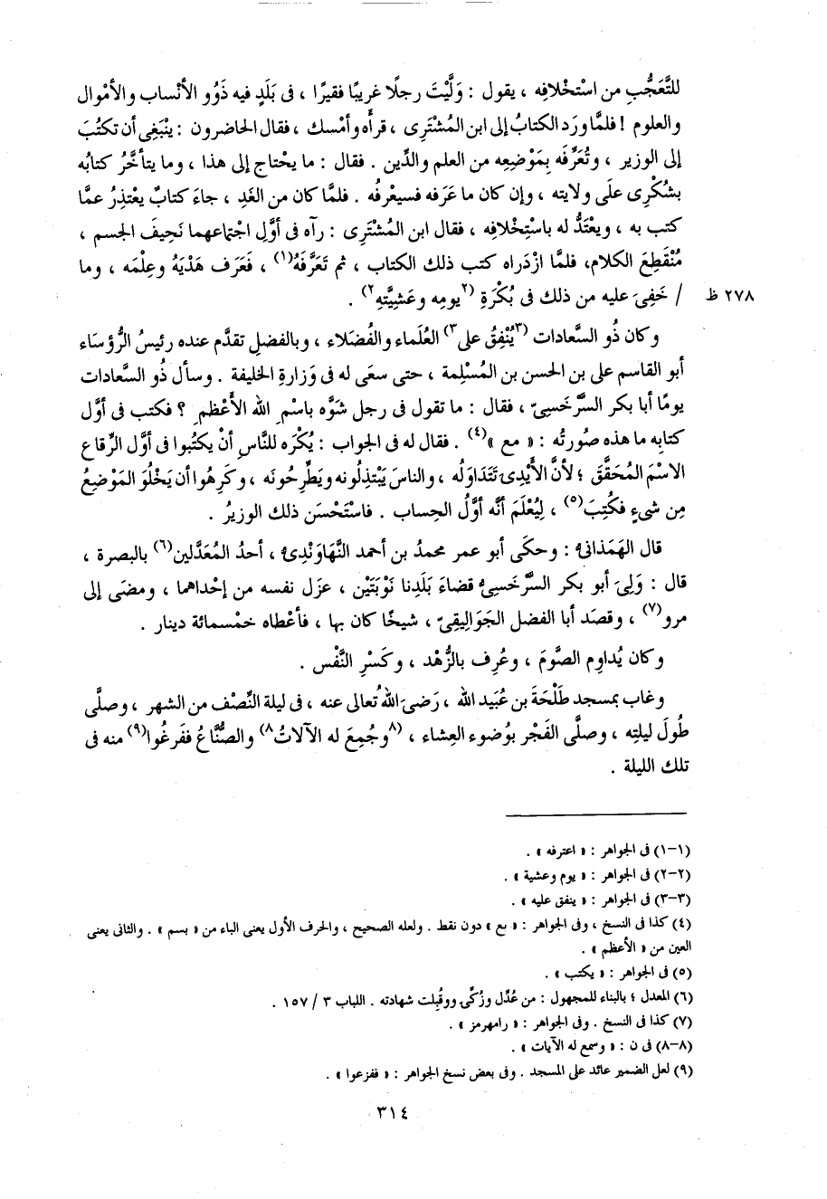 و كان ذو السّعادات 3 ينفق على 3 العلماء و الفضلاء، و بالفضل تقدّم عنده رئيس الرّؤساء أبو القاسم على بن الحسن بن المسلمة، حتى سعى له فى وزارة الخليفة. و سأل ذو السّعادات يوما أبا بكر السّرخسىّ، فقال: ما تقول فى رجل شوّه باسم اللّه الأعظم؟ فكتب فى أوّل كتابه ما هذه صورته: «مع» 4. فقال له فى الجواب: يكره للنّاس أن يكتبوا فى أوّل الرّقاع الاسم المحقّق؛ لأنّ الأيدى تتداوله، و الناس يبتذلونه و يطّرحونه، و كرهوا أن يخلو الموضع من شاء فكتب 5، ليعلم أنّه أوّل الحساب. فاستحسن ذلك الوزير.
